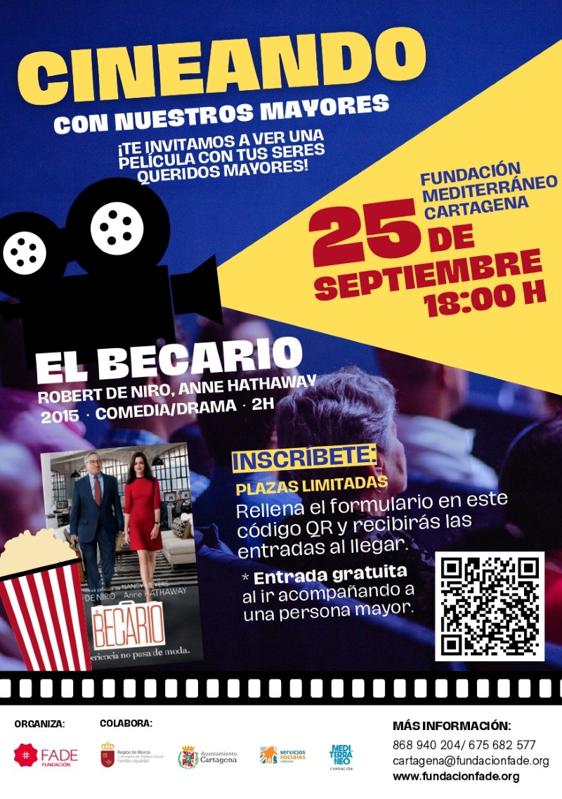 Con estos propósitos, Fundación FADE en el marco de su proyecto 'Acompañando' con la colaboración de Servicios Sociales del Área de Política Social, Igualdad y Familia del Ayuntamiento, organiza la actividad Cineando con Nuestros Mayores, el próximo miércoles 25 de septiembre a las 18 horas, en la Fundación Mediterráneo de Cartagena, donde se podrá ver la película El Becario, una comedia protagonizada por Robert de Niro y Anne Hathaway.
