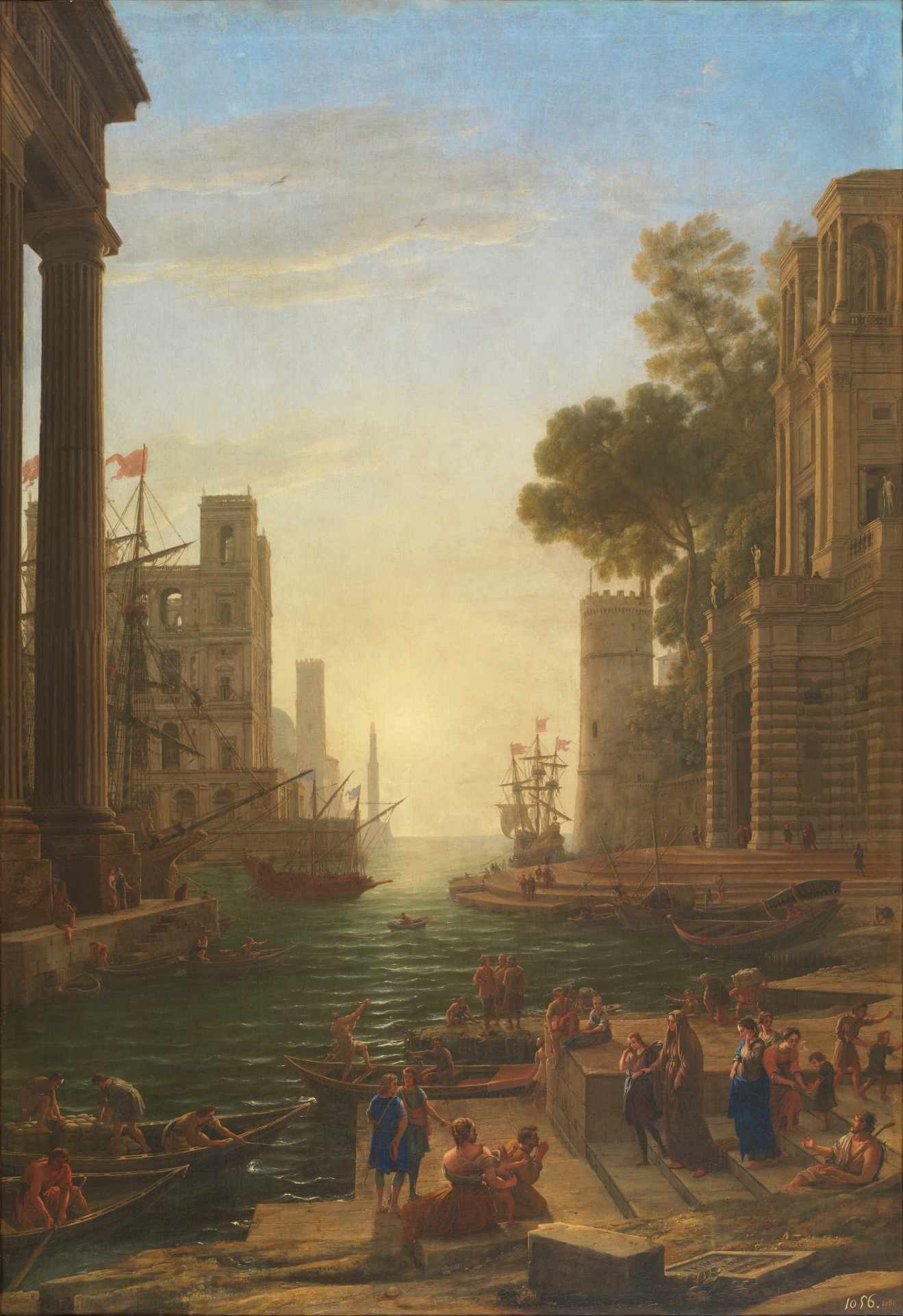 Cuando Claudio de Lorena pintaba escenas del pasado, mostraba una arquitectura grandiosa y monumental. Esto se observa en el colosal tempo dórico de la izquierda y en el resto de palacios y fortalezas. Sin embargo, Claudio no estaba interesado en mostrar la Antigüedad de forma precisa y correcta, sino en representar una imagen nostálgica que aluda a la imagen de grandeza, equilibrio y serenidad de que se tenía de la Roma Imperial. Esto se aprecia en los barcos, pues son navíos mercantes de su tiempo.