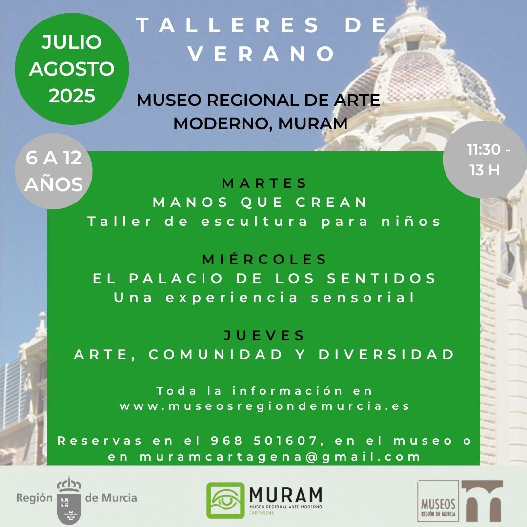El Museo Regional de Arte Moderno, MURAM, programa talleres infantiles, para niños de 6 a 12 de años, durante los meses de julio y agosto. Estas actividades se realizarán los martes, miércoles y jueves, de 11:30 a 13:00 horas. Son gratuitos, previa inscripción en muramcartagena@gmail.com o 968 501607.