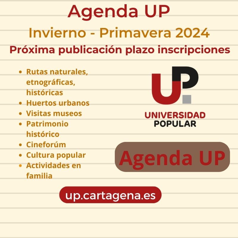 La Universidad Popular está preparando para el año 2024 la AGENDA UP, dirigido a población en general contiene rutas, visitas guiadas, charlas, ponencias, exposiciones, mesas redondas, etc, relacionados con distintos aspectos de la cultura, la educación, la vida social, el medio ambiente, la etnografía, la literatura, etc.