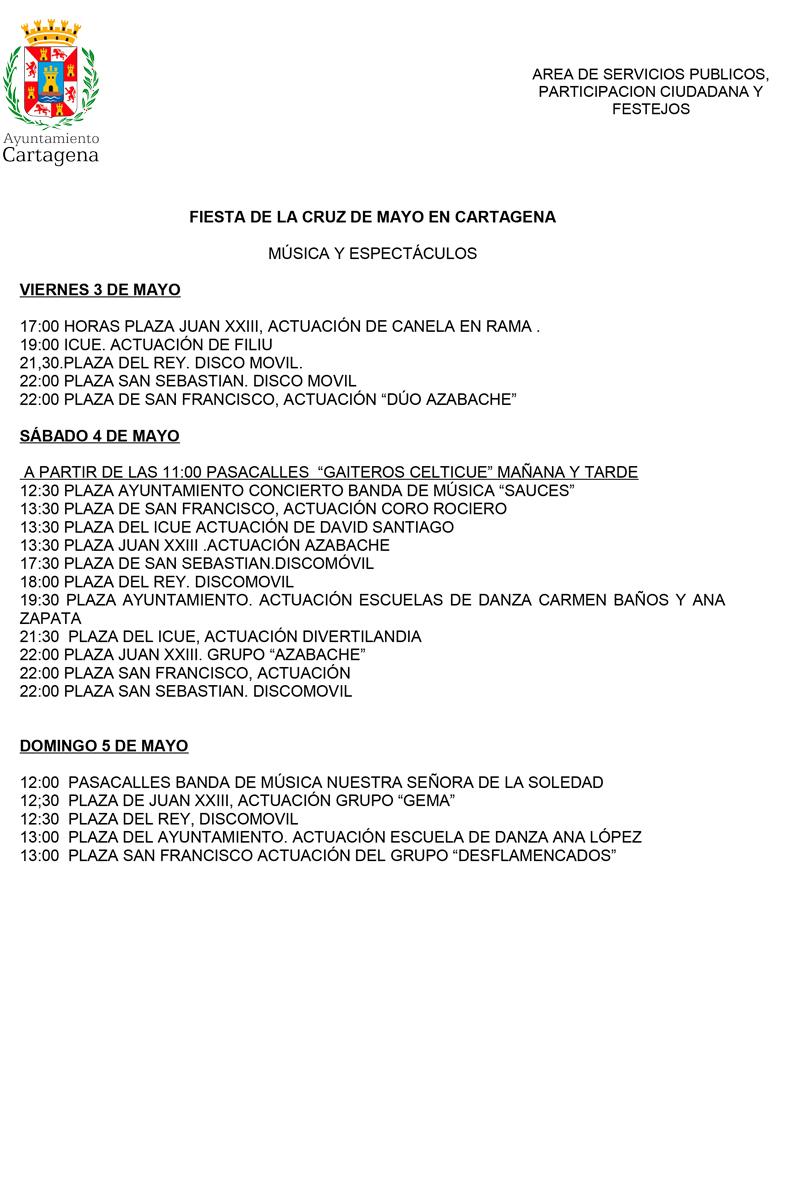 viernes 3 de mayo, las Cruces de Mayo arrancan a las 17 horas, con actuaciones musicales en la Plaza Juan XXIII, a las 19 horas en la Plaza del Icue, a las 21:30 horas en la Plaza del Rey, a las 22 horas en la Plaza San Francisco y Plaza San Sebastián.