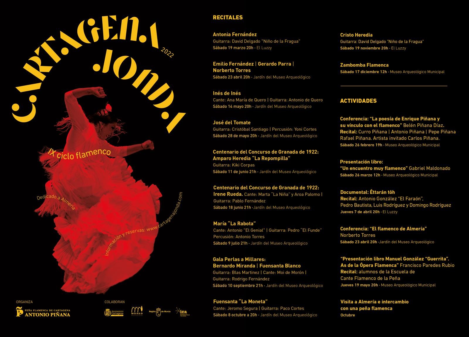 El Ciclo Flamenco Cartagena Jonda dedica su IX edición a Almería. El certamen organizado por peña flamenca Antonio Piñana, en colaboración con el Ayuntamiento, ha programado para este 2022 una amplia oferta de recitales de cante y baile, así como diferentes actividades relacionadas con los cantes de esta tierra. Toda la programación está disponible en su web oficial.