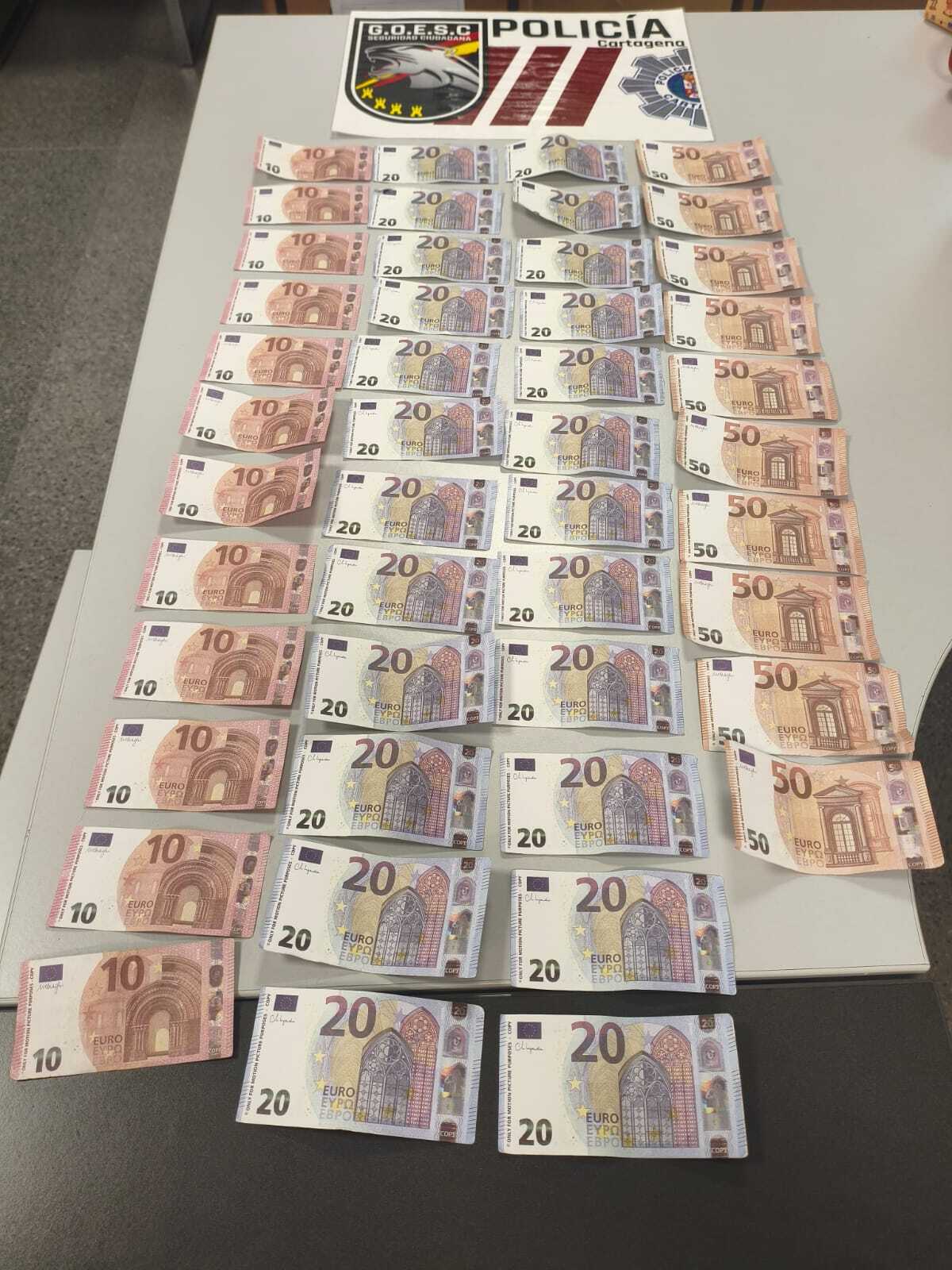 En el mismo orden, la madrugada del sábado día 13, la unidad GOESC (Grupo Operativo Especial de Seguridad Ciudadana), en sus labores de vigilancia de las fiestas populares, en este caso en el recinto festero de la diputación de El Algar, observaron dentro de una de las casetas festeras a un varón en actitud sospechosa. Cuando los agentes procedieron a su identificación y cacheo reglamentario, encontraron en el interior de su cartera gran cantidad de billetes de euro falsos, en concreto 1.100 euros. Los agentes redactaron diligencias por un presunto delito de falsificación de moneda con el implicado como investigado.