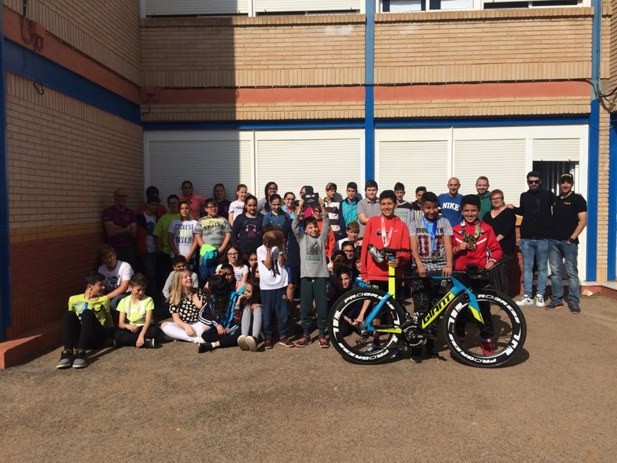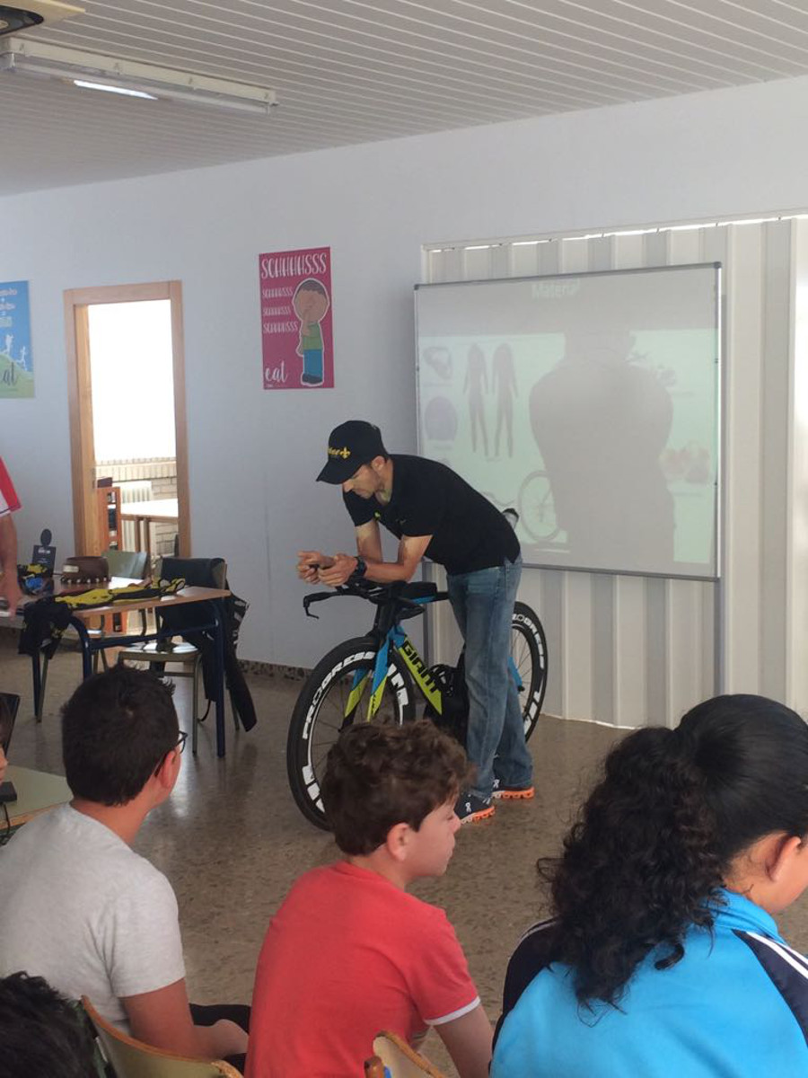 Para finalizar la jornada los escolares han tenido la oportunidad de ver y probar algunos de los elementos que se utilizan en estas pruebas, como la bicicleta, el casco, la vestimenta y material del propio Andújar. Además, el triatleta ha firmado autógrafos y se ha fotografiado junto a los alumnos en una instánea de grupo para el recuerdo.