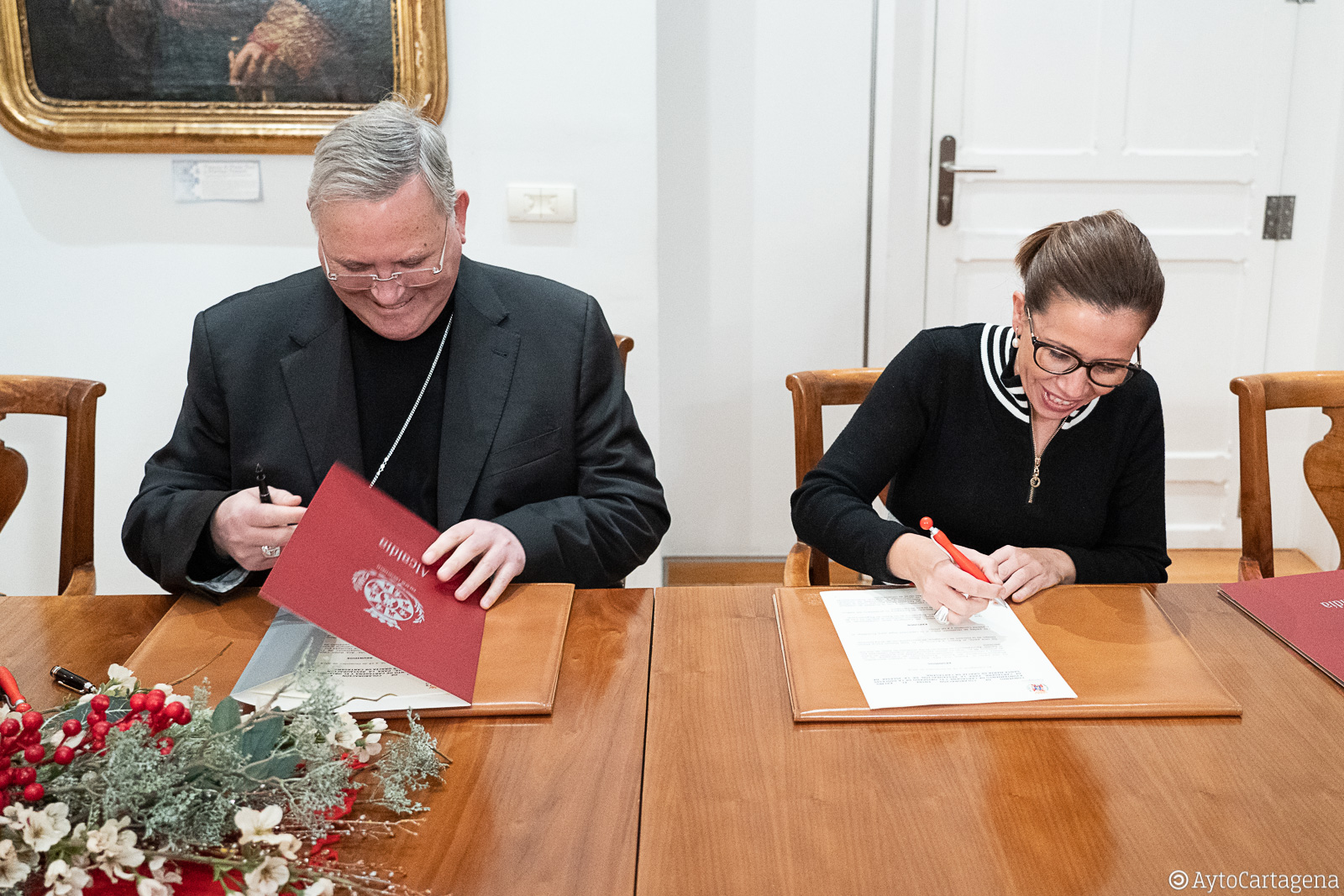 Ana Belén Castejón y el obispo de la Diócesis de Cartagena, José Manuel Lorca Planes, han firmado este martes, 18 de diciembre, el