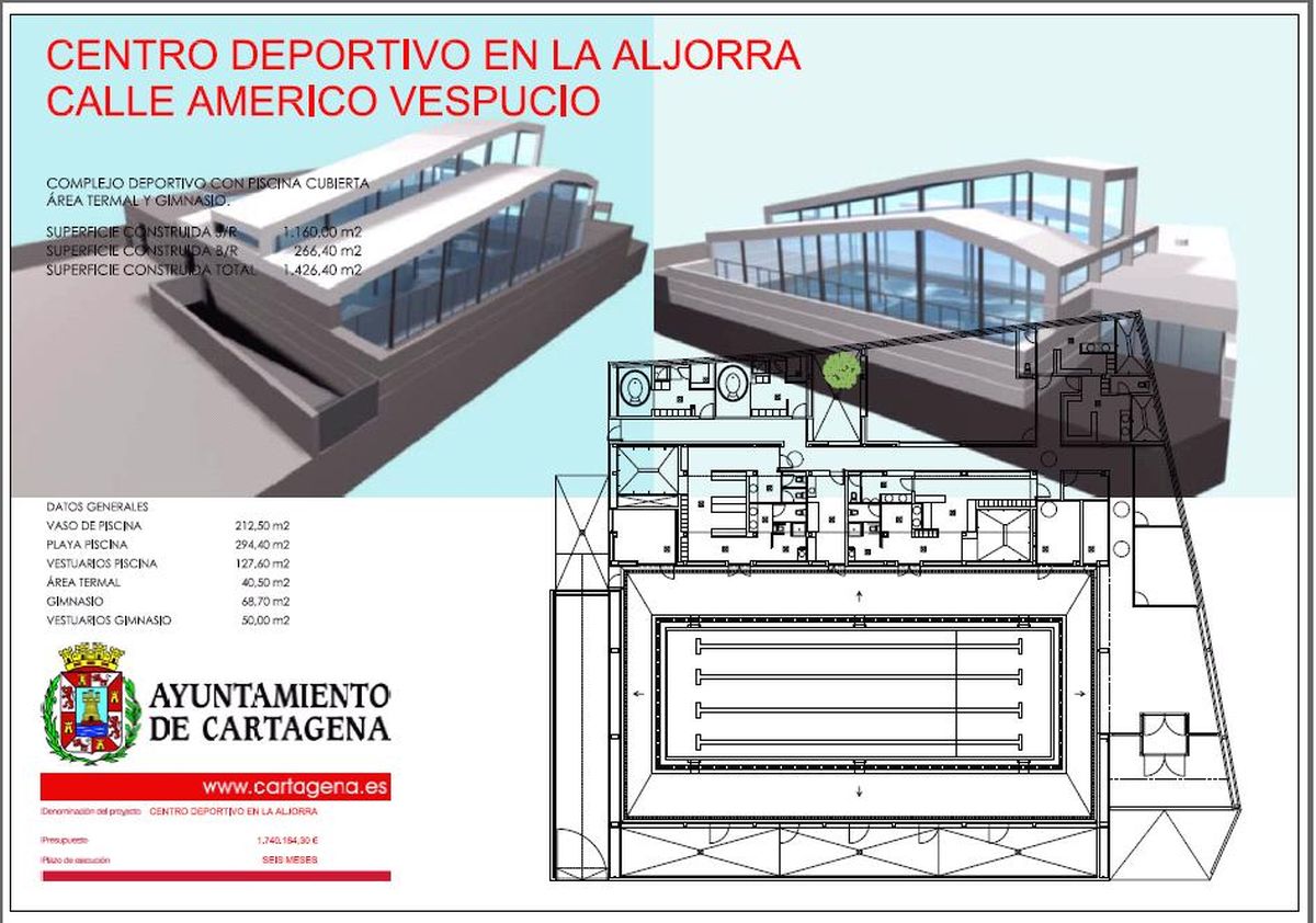 En lo que se refiere al primer proyecto, el de La Aljorra, consistirá en la construcción de un centro deportivo en la calle Americo Vespucio, que incluye un vaso de piscina de 25 por 8,5 metros, un área termal para ambos sexos y un gimnasio con vestuarios independientes.