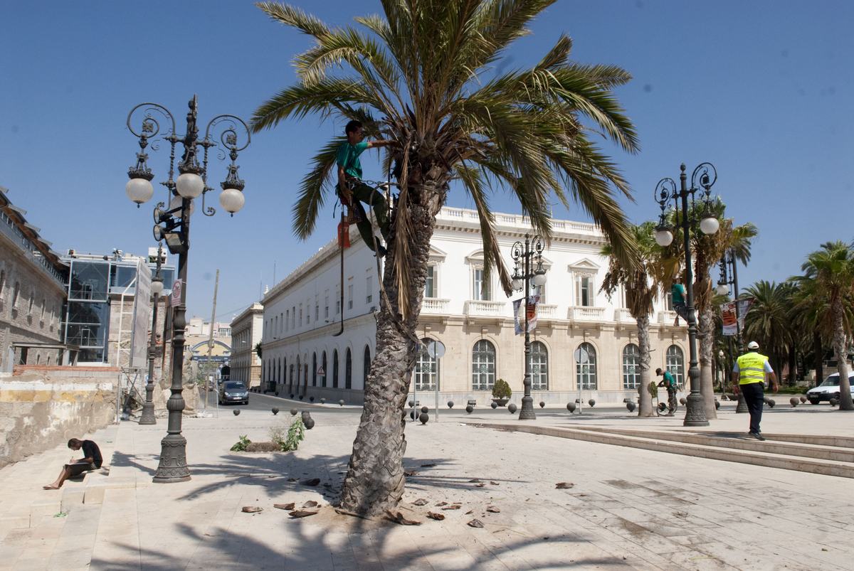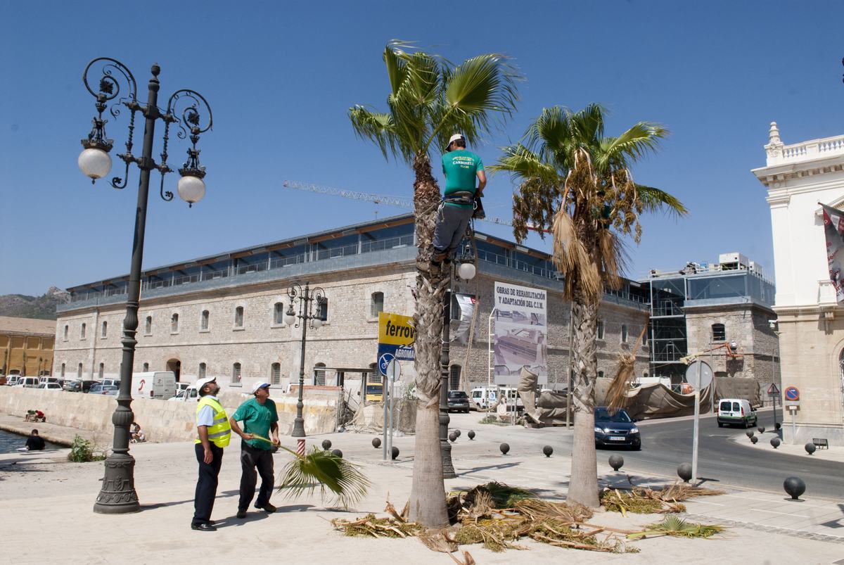 La Delegación de Parques y Jardines de la concejalía de Infraestructuras está llevando a cabo la poda de hojas secas de los 397 ejemplares de palmeras situadas en la zona del Puerto de Cartagena y distribuidas por la Cuesta del batel, Paseo Alfonso XII, Muralla del Mar y en la Plaza de Héroes de Cavite.