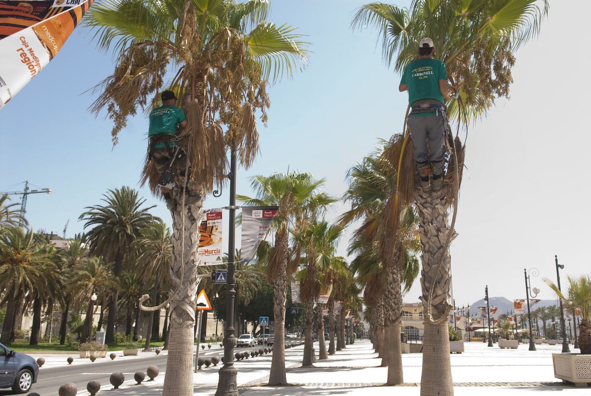 Los trabajos de mantenimiento se están realizando en varias fases, y tienen como objetivo evitar la caída de las palmas a la vía pública y embellecer el porte de los ejemplares que jalonan el frente marítimo de la ciudad, sobre todo, con motivo del evento deportivo Audi MedCup, que se desarrollará del 14 al 19 de septiembre.