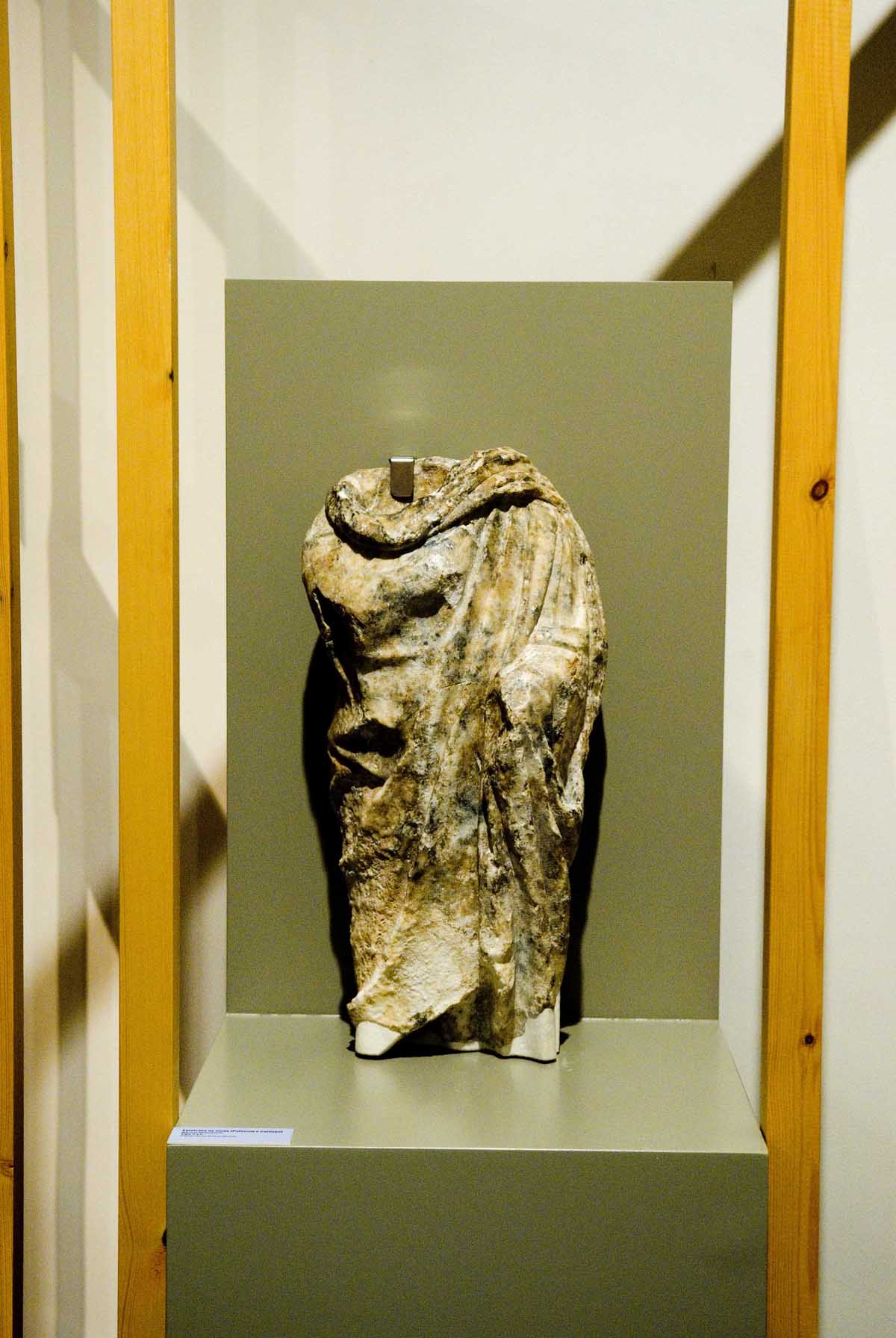 En las recientes excavaciones en el Molinete, se ha recuperado un nutrido conjunto de esculturas, conservadas en estado muy fragmentario, pero de gran interés histórico y arqueológico. En Dioses y hombres de mármol (Sección 6), junto a la excepcional cornucopia de la palestra de las termas (exhibida en la Sección III) y la estatuilla de la musa Polimnia íntegramente envuelta en un manto, destacan los hallazgos de una espléndida cabeza de divinidad femenina, acaso Venus o una ninfa, y de un fragmento de retrato femenino, el primero constatado en la colonia: la particularidad del bucle que desciende permite fecharlo en época de Augusto y adscribirlo a un peinado muy a la moda entre las damas de alta condición de la época. Otros fragmentos pudieron pertenecer a la decoración frontal de pies de mesas de mármol (monopodia), muebles de lujo que rivalizaron con los elaborados en bronce y consienten entrever cómo era el ajuar de los edificios de la ciudad.