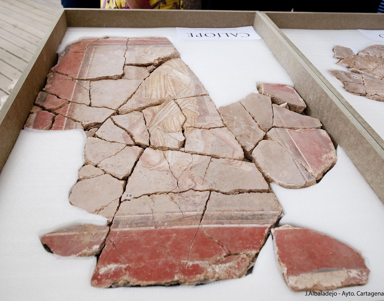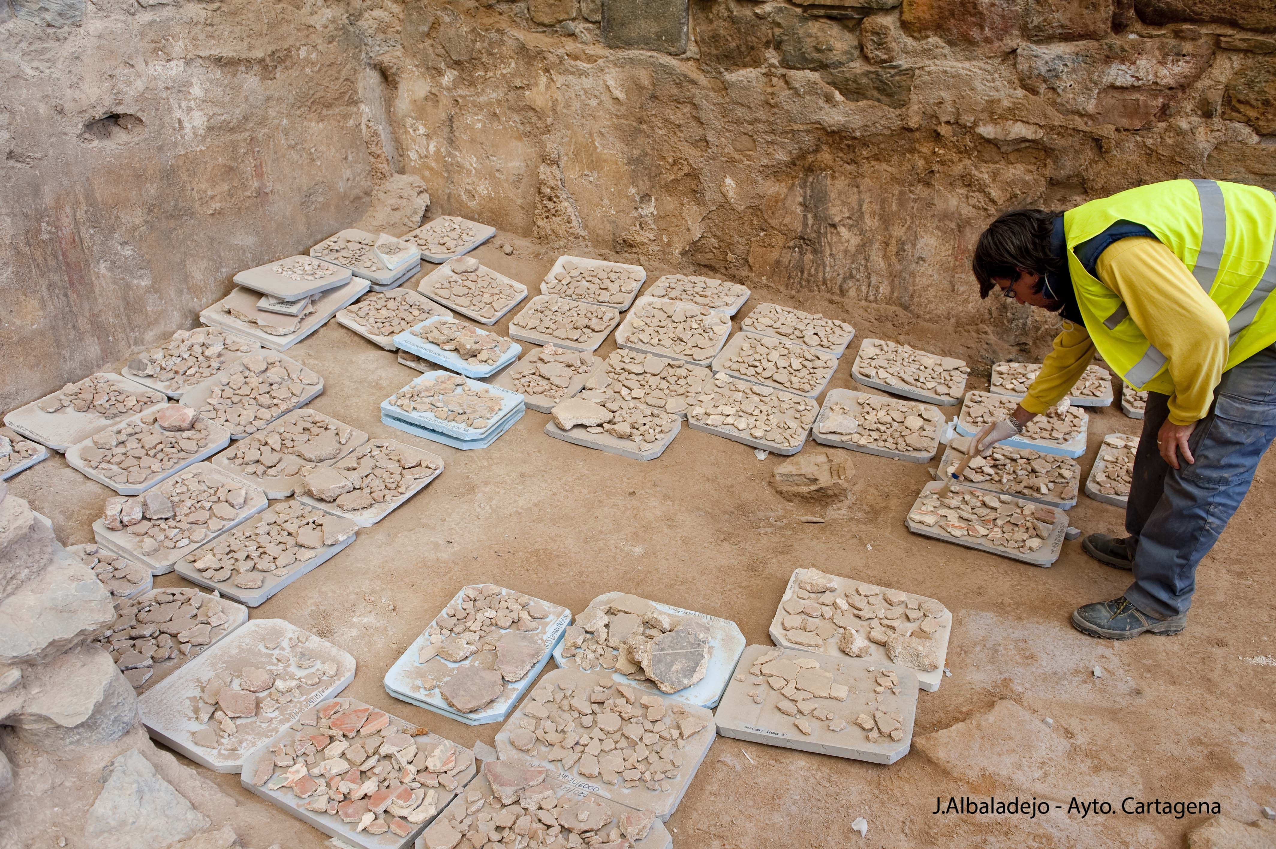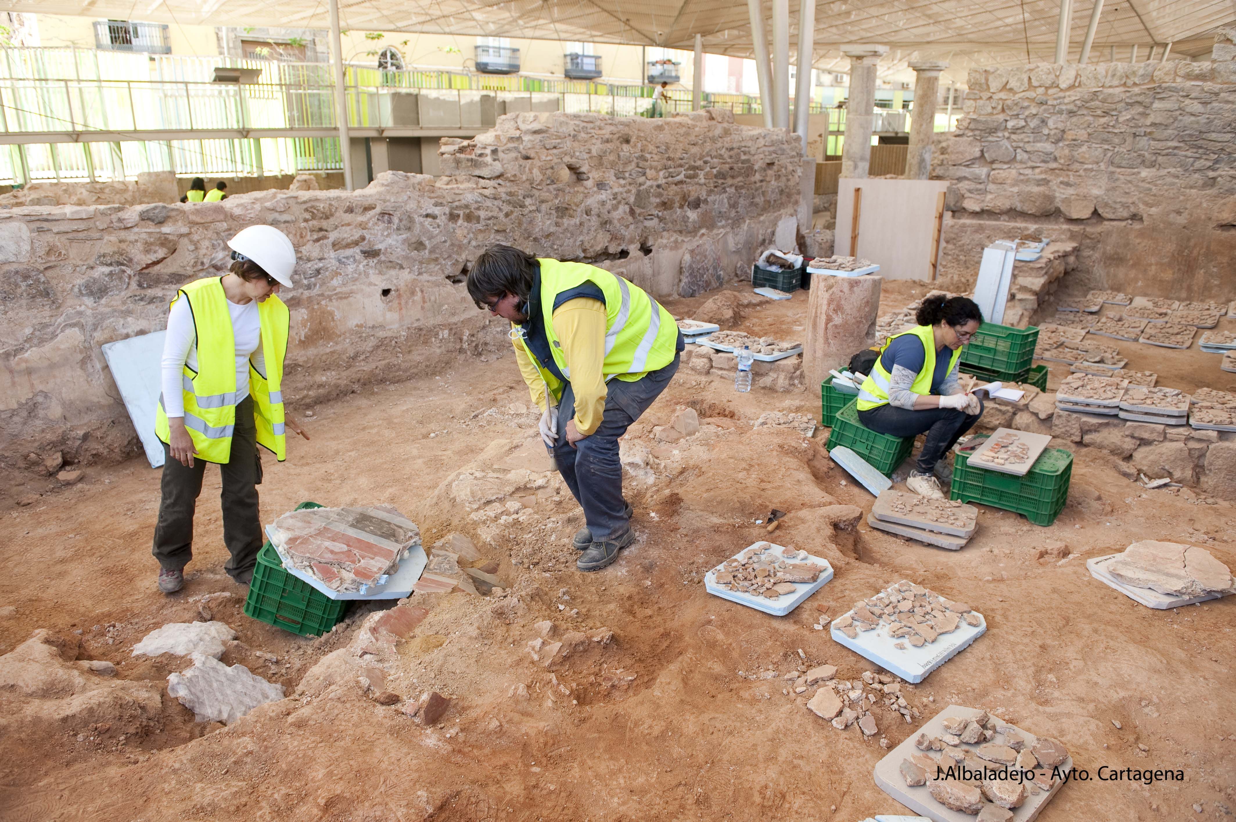 Estos resultados se han logrado tras excavar con metodología arqueológica unos 500 m3 de tierra y recuperar unas 1.200 cajas de materiales arqueológicos, de las cuales cerca de 1.000 son de fragmentos de pintura mural procedentes de los muros y tabiques de las salas de banquetes.