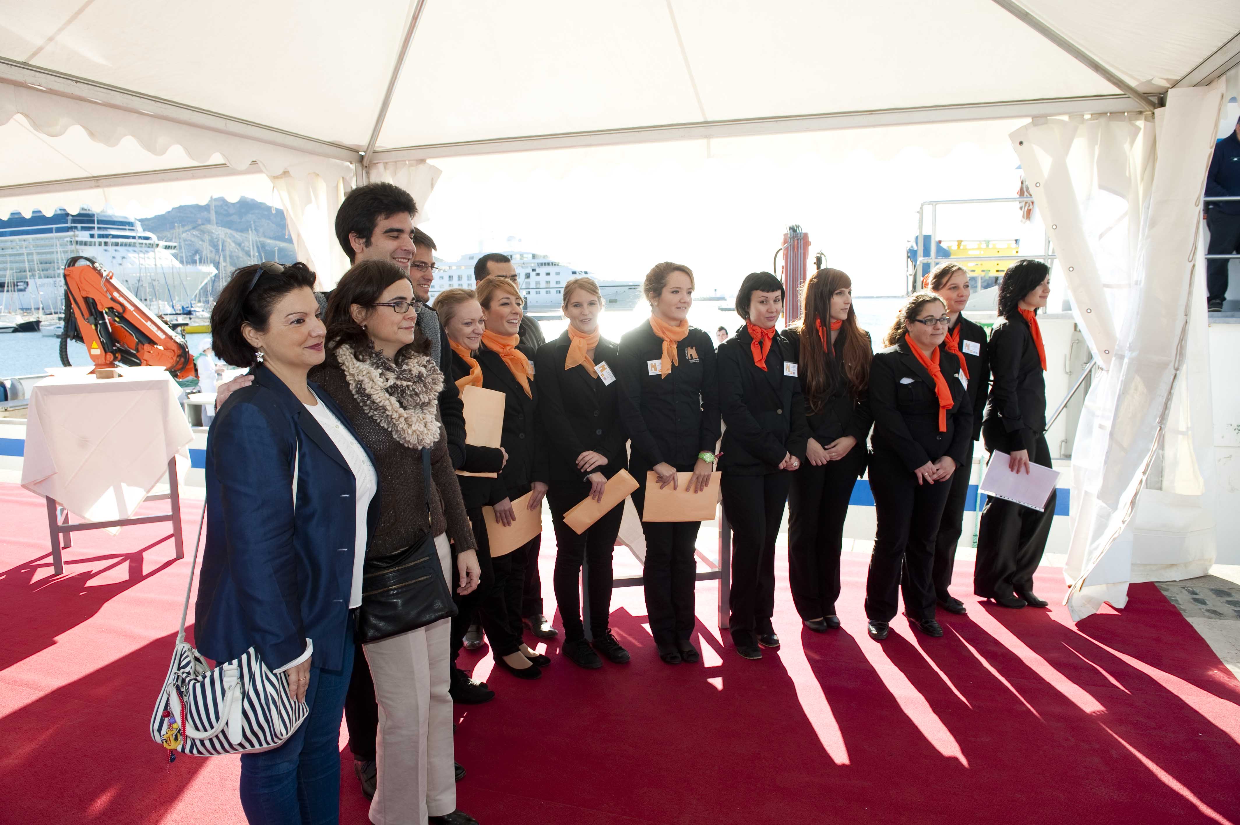 El curso de corte de productos de acuicultura marina se ha desarrollado a bordo del catamarán de una piscifactoría de la zona. Es más, los alumnos podrán subir mañana a bordo de uno de los dos cruceros que llegan el viernes a Cartagena y conocer las instalaciones de cocina.