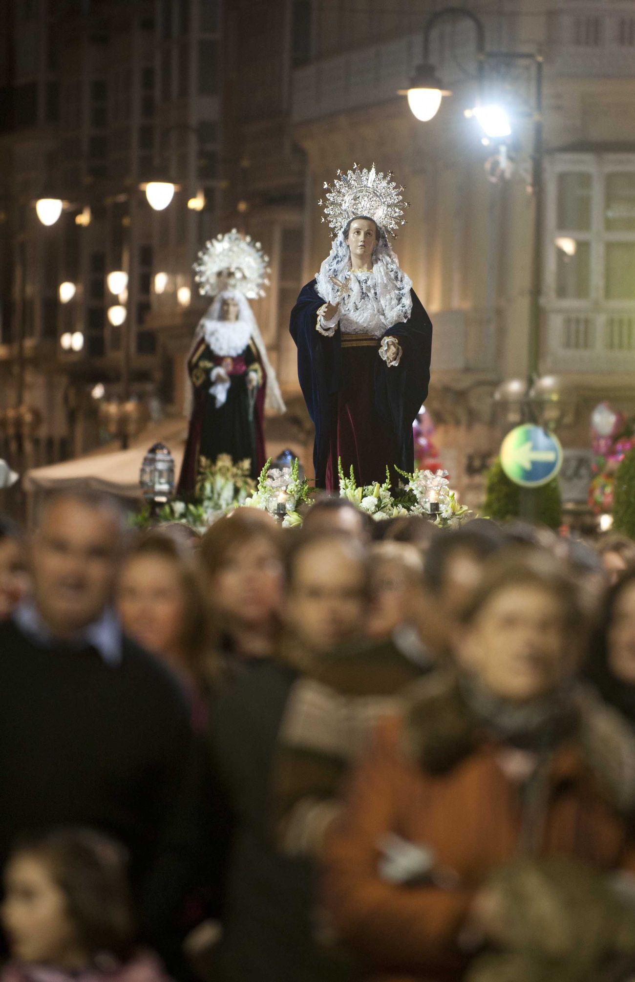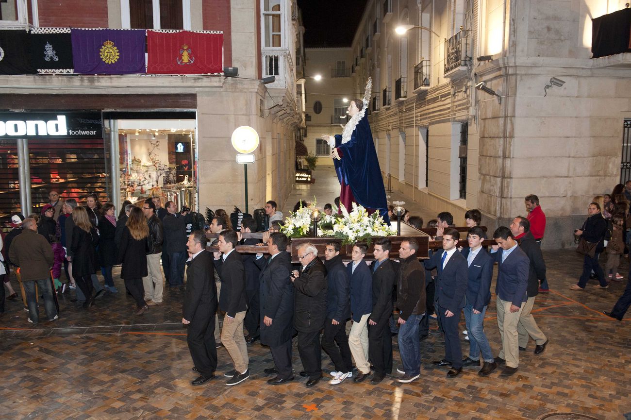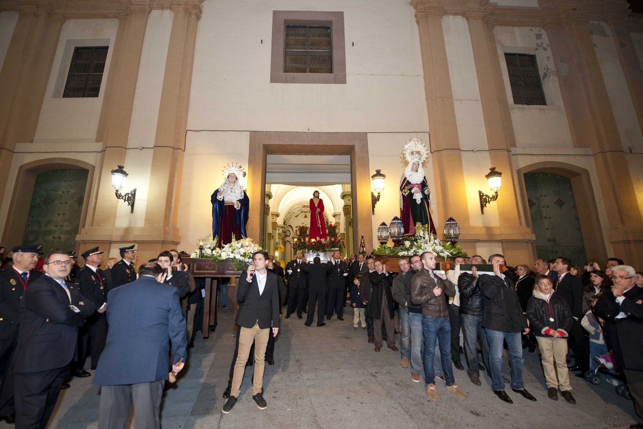 La emoción pasó a un primer plano cuando la Virgen de la Esperanza, la de la Vuelta del Calvario y el Cristo de la Sentencia, de la Cofradía California, se unieron en la calle del Carmen, continuando los tres por Puertas de Murcia, Plaza San Sebastián, Aire hasta la Iglesia de Santa María de Gracia.