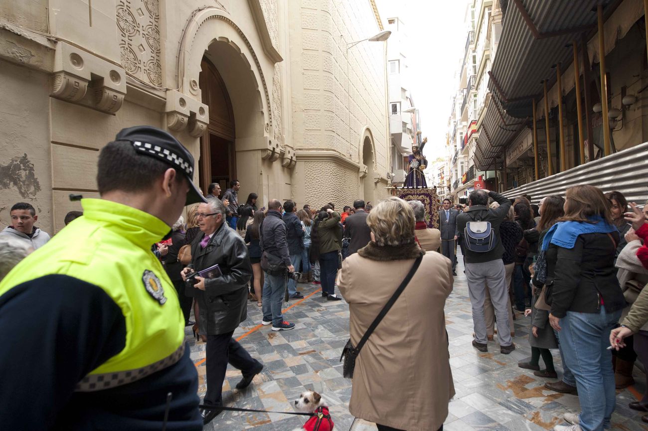 En torno a las ocho y media, el Cristo de la Sentencia salía a la calle para goce de sus fervientes devotos. Una veintena de policías nacionales cargaban con la imagen que estuvo escoltada por la inmensa mayoría de los altos cargos de la Policía Nacional.