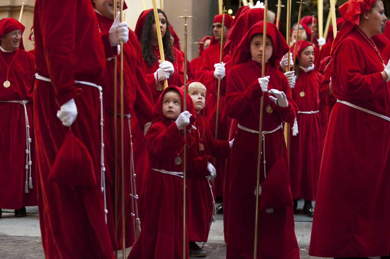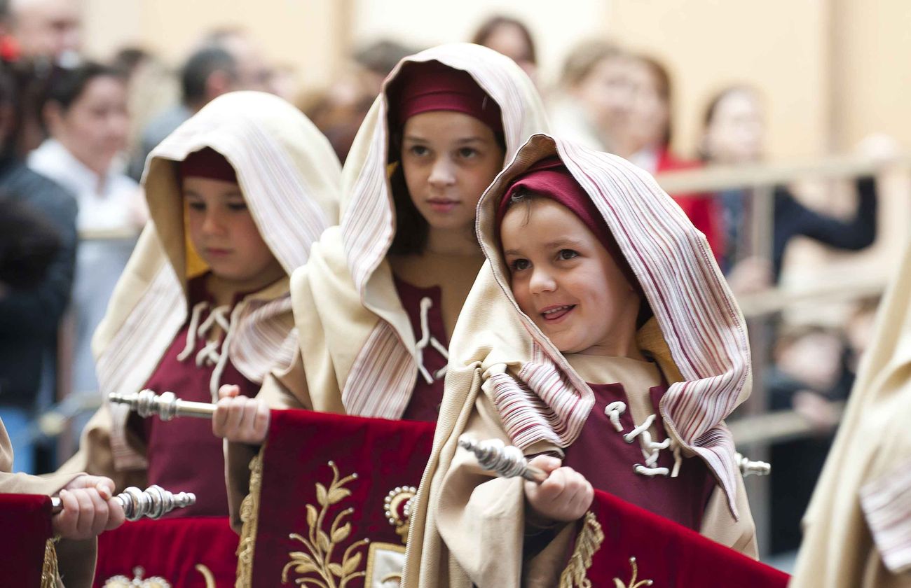 Los niños y niñas de la Cofradía California fueron los protagonistas del Domingo de Ramos. A las cinco de la tarde, las puertas del templo de Santa María de Gracia se abrían, mientras los primeros aplausos empezaron a sonar entre la multitud de personas que se agolpó en la calle Aire.