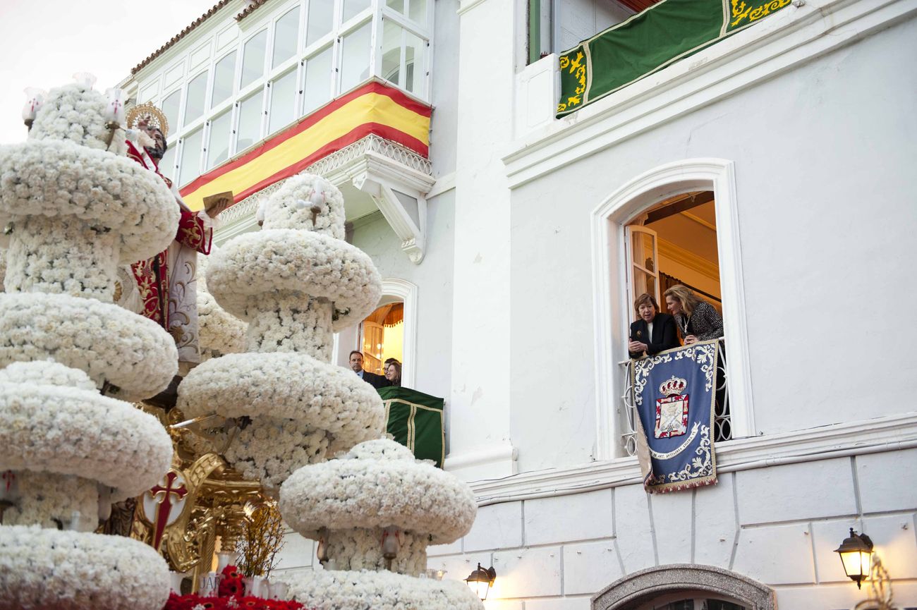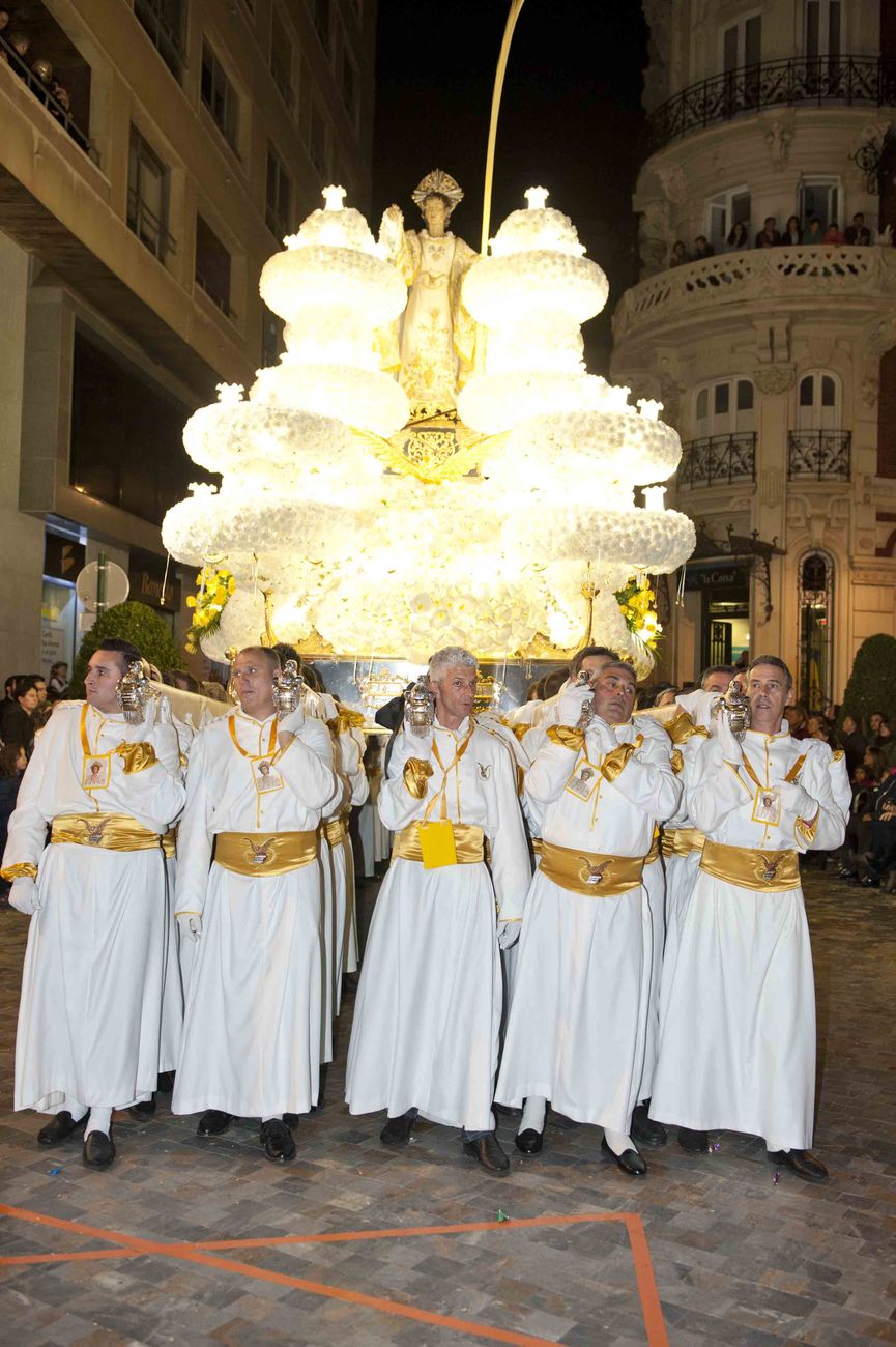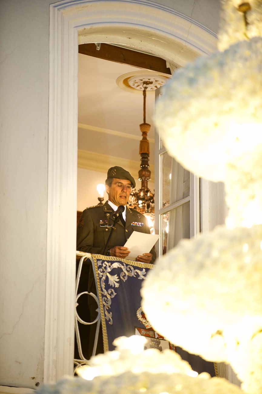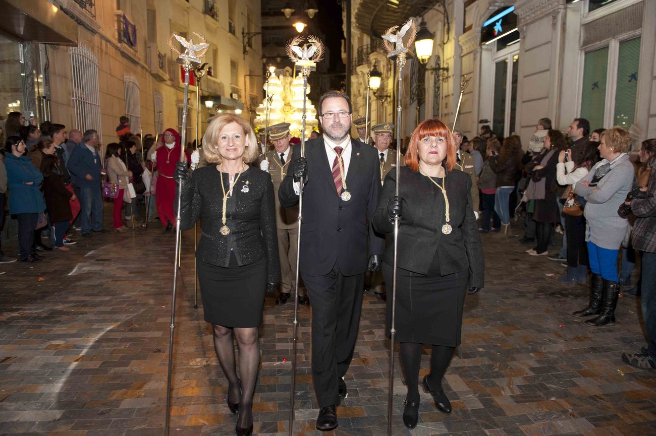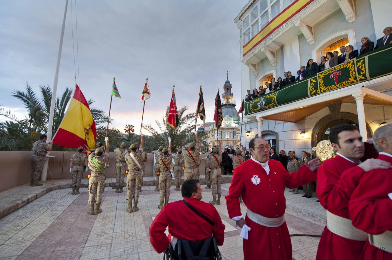 A las siete y media de la tarde, cientos de cartageneros se agolpaban en torno a dos centros militares. El primero de ellos, el Parque de Artillería, para ser testigos de la salida de San Juan Evangelista, agrupación que en 2013 celebra el septuagésimo primer aniversario de su fundación. Con motivo de este aniversario, por la mañana, la alcaldesa de Cartagena recibió en el Palacio Consistorial a los coroneles de Artillería que han pasado por la ciudad y que son presidentes de honor de dicha agrupación.