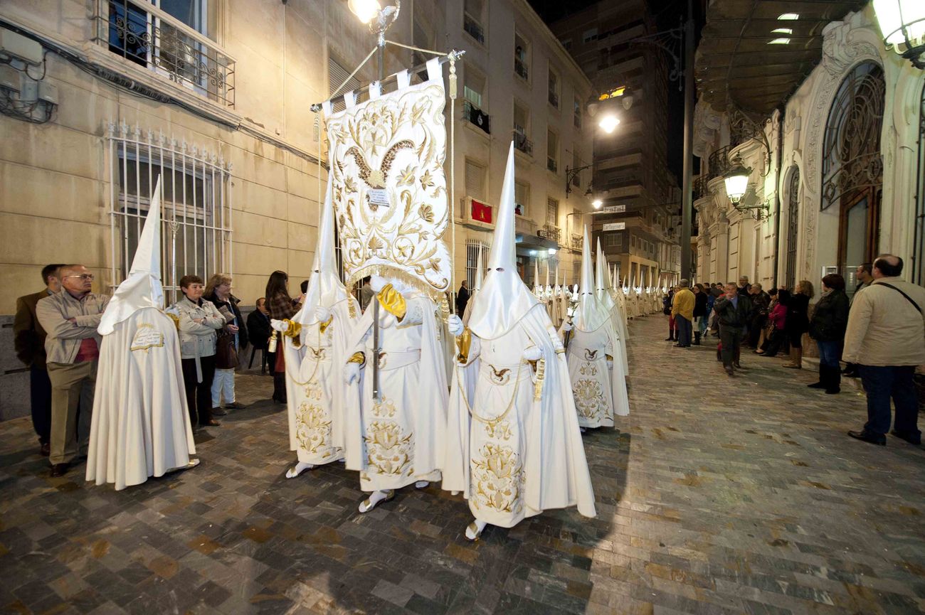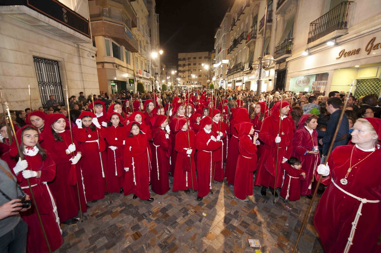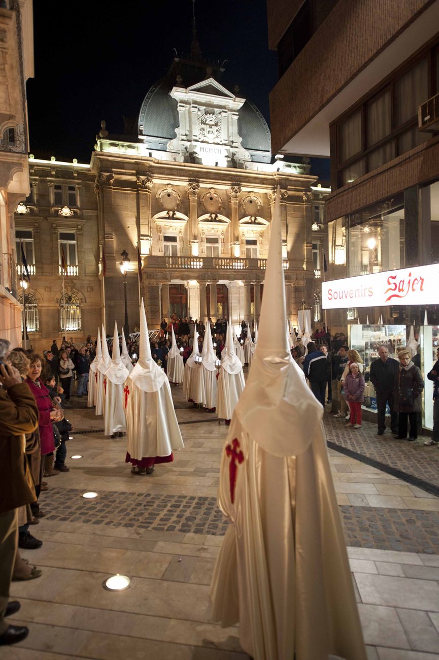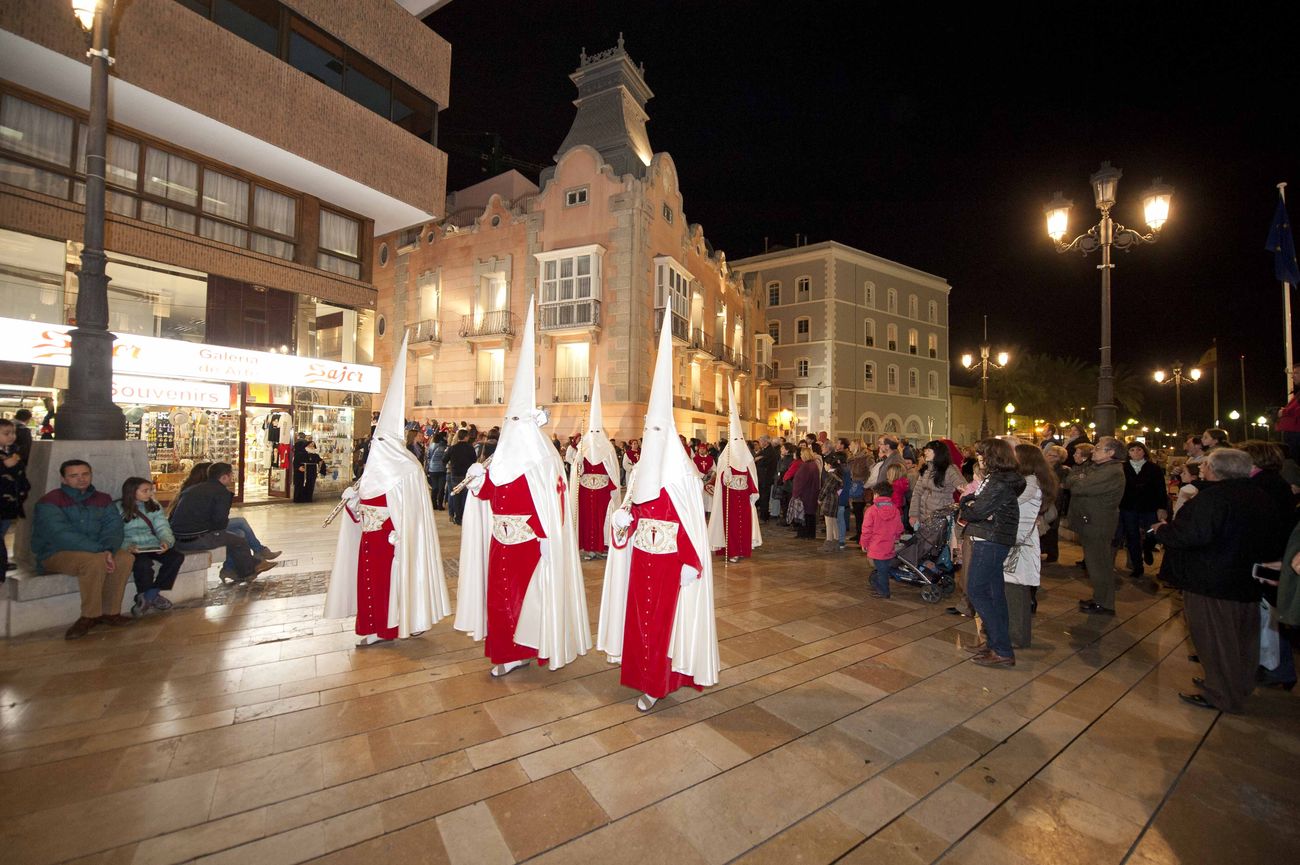 La lentitud marcó el ritmo de los tronos que, con paso firme, avanzaban hacia la Plaza de San Sebastián, el punto de encuentro de los tres Apóstoles. De ahí, las imágenes de la Cofradía California ponían rumbo hacia el templo de Santa María de Gracia, que cerró sus puertas después de las once de la noche, poniendo fin al Martes Santo de Cartagena.