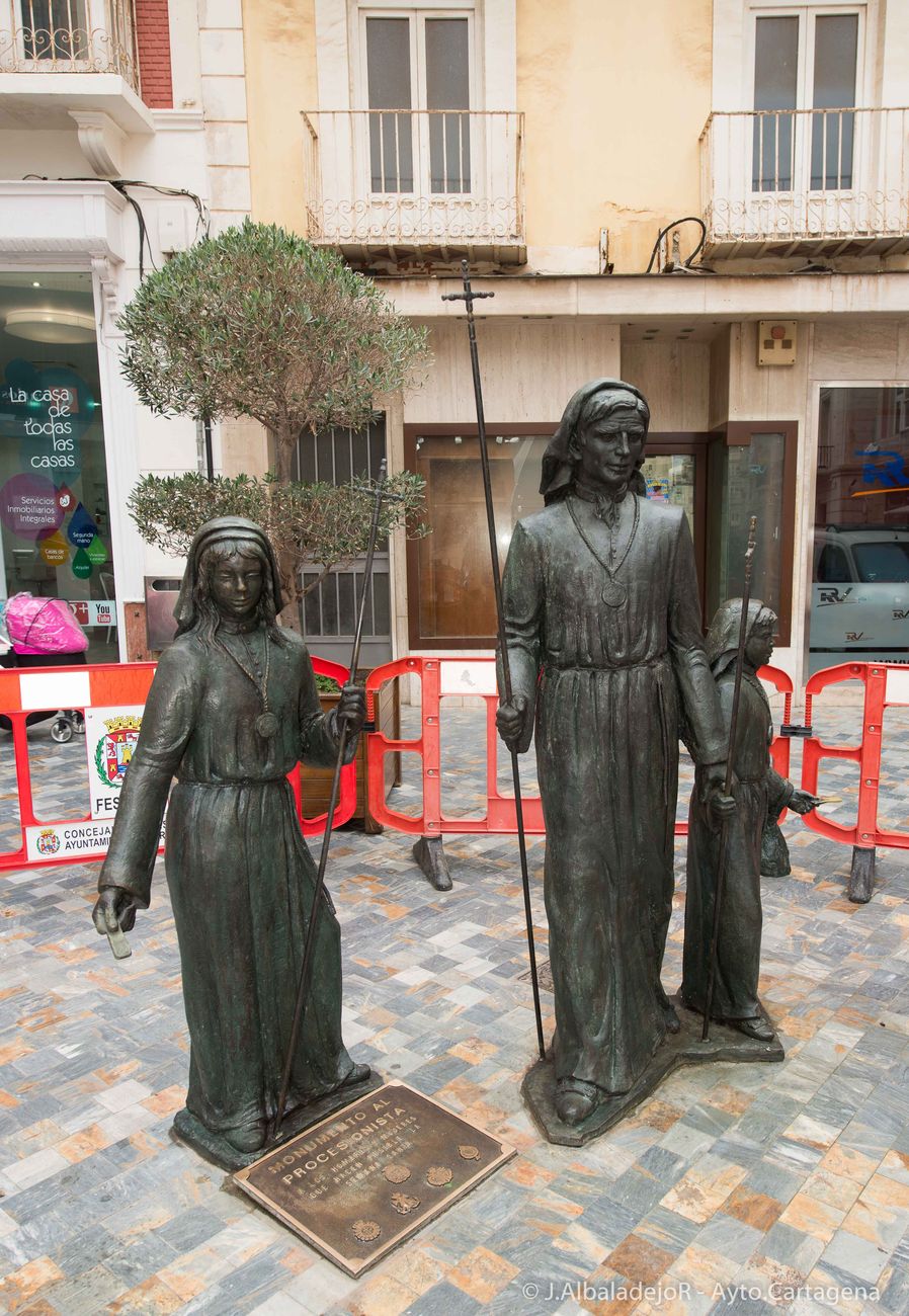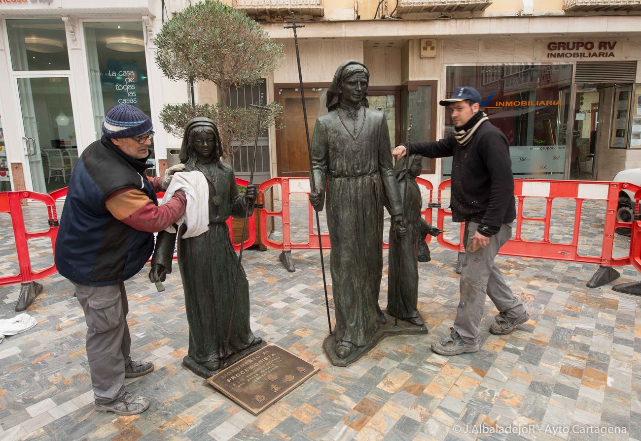 Tras una pátina el monumento el monumento ha quedado como nuevo y dispuesto para que los turistas puedan fotografiarlo como representación de las procesiones de la Semana Santa de Cartagena.