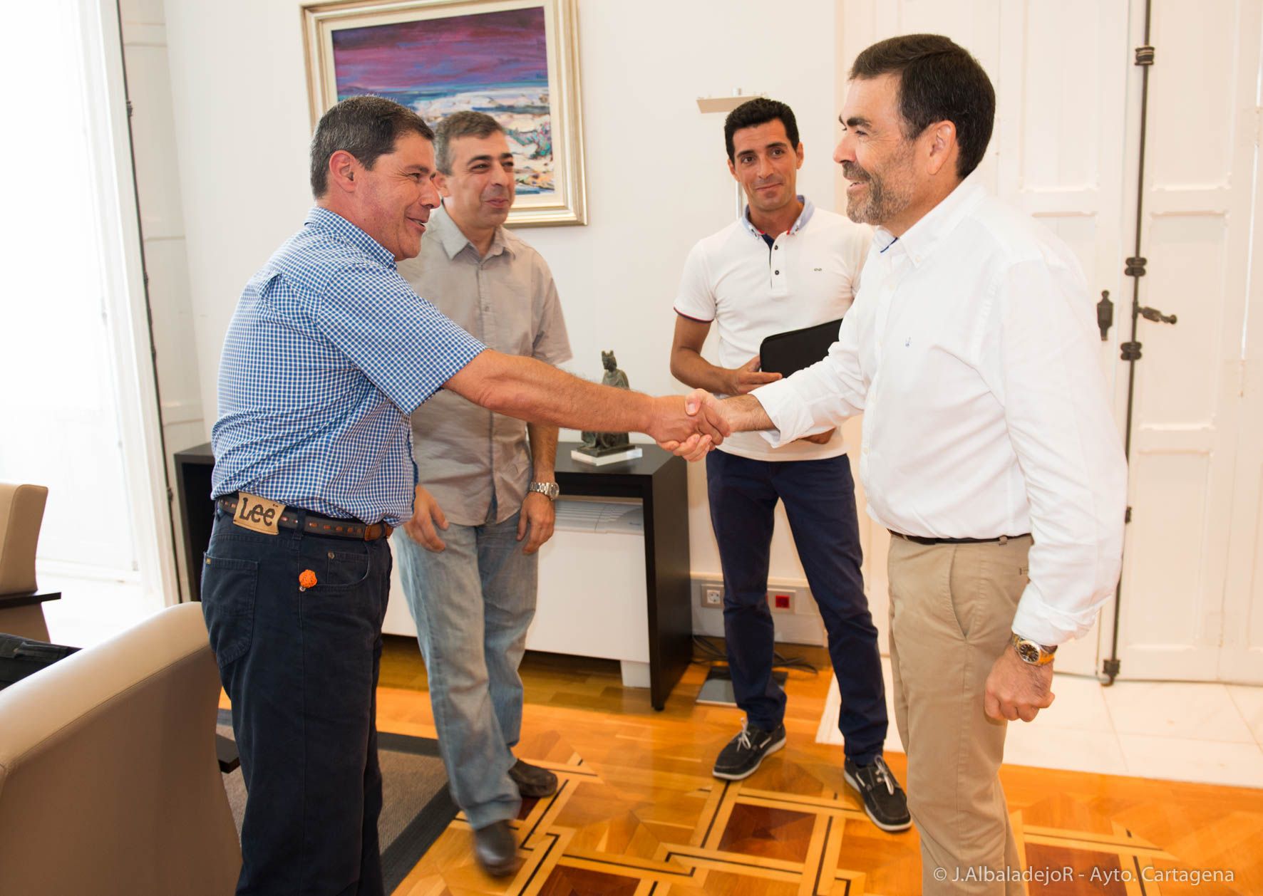 El alcalde de Cartagena, José López y el concejal del Área de Transparencia y Buen Gobierno, Participación, Descentralización y Festejos, Juan Pedro Torralba, se ha reunido esta mañana con la Entidad de Conservación del Polígono de Santa Ana, concretamente con su presidente, Jorge Juan Morales Leante, el vocal de seguridad, Eduardo Vilar y otro miembro de la entidad, Fernando Sánchez.