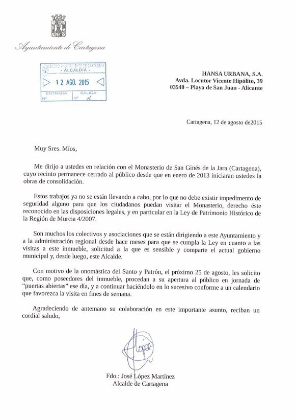 En este sentido, ha enviado una petición escrita a Hansa Urbana, empresa responsable de las obras de consolidación del edificio, para que permita una jornada de puertas abiertas, el día 25 de agosto, festividad de San Ginés, como inicio de un calendario que favorezca las visitas los fines de semana.