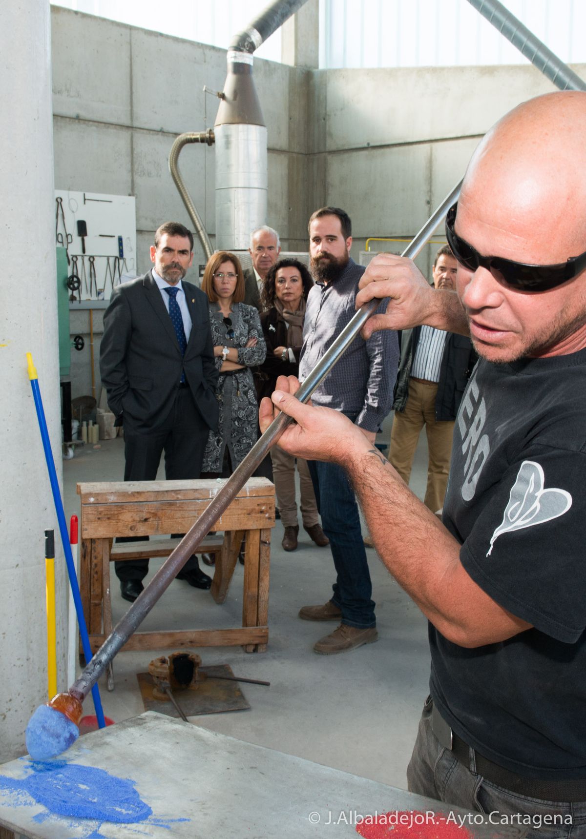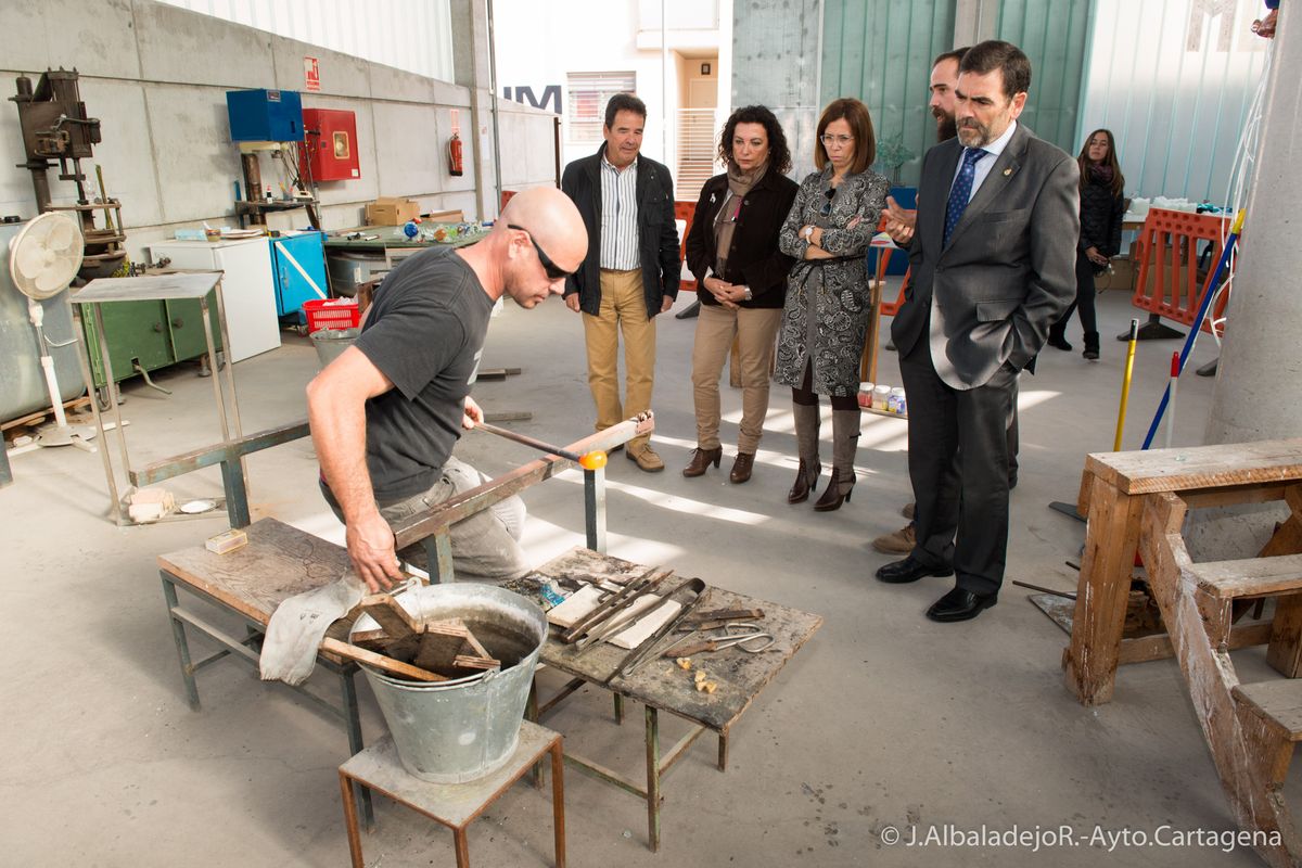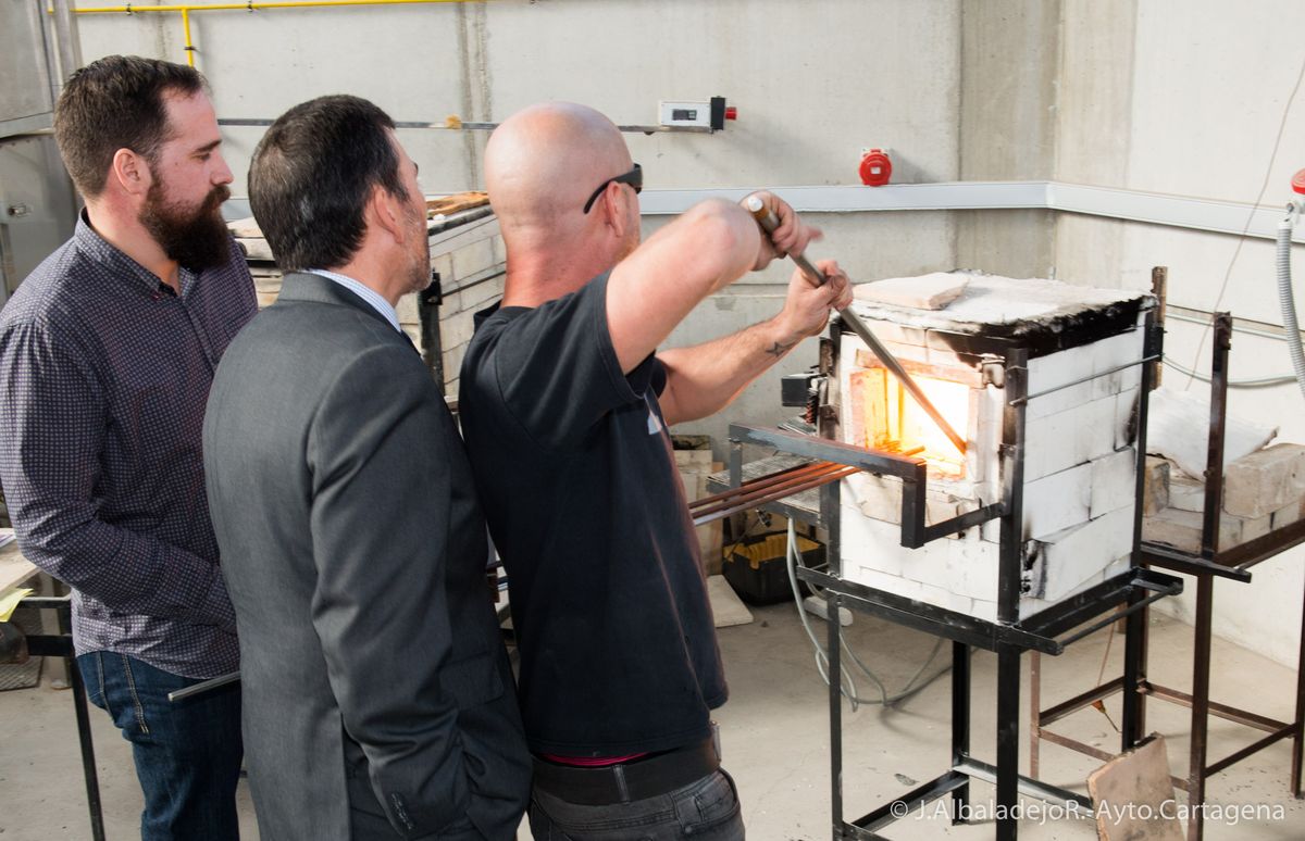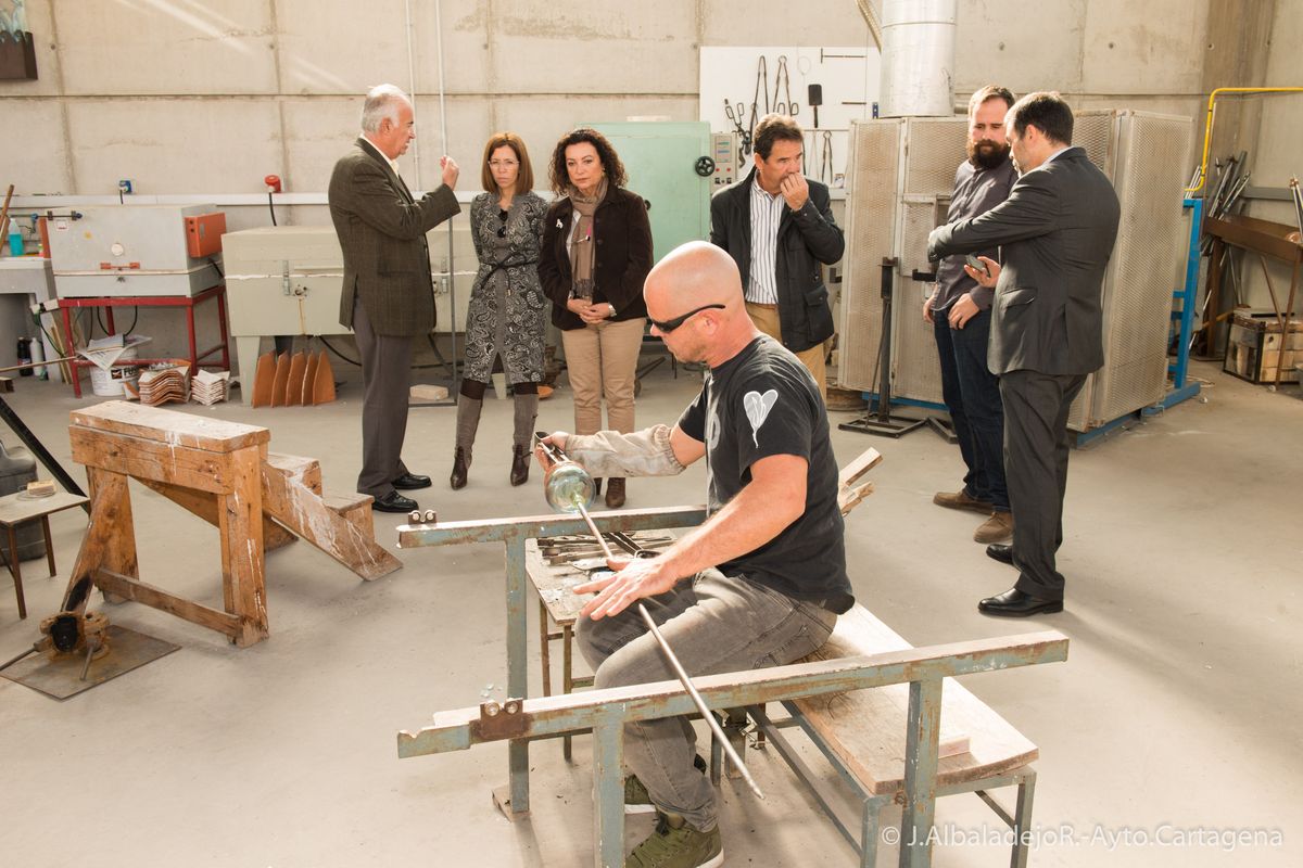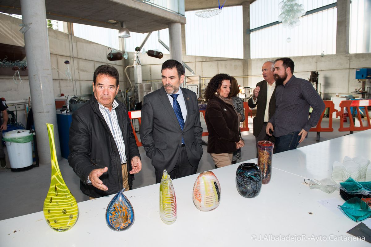 La asociación de artesanos vidrieros del barrio de Santa Lucía, encabezados por su presidente Manuel Gil, han guiado por las instalaciones del Museo del Vidrio al primer edil, José López, a la vicealcaldesa, Ana Belén Castejón, y a Obdulia Gómez, Concejala de Industria.