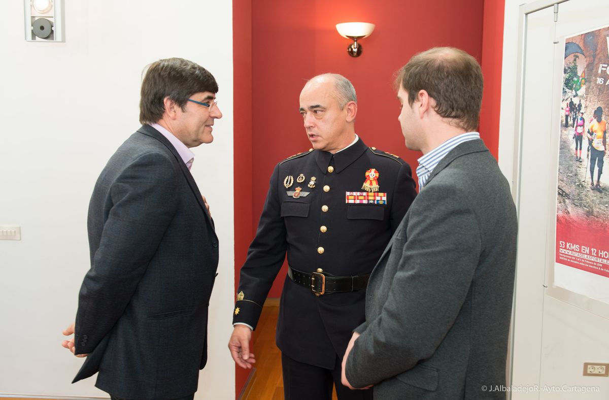 La ya tradicional carrera de la Ruta de las Fortalezas alcanza su edición número siete en una cita que tendrá lugar el 16 de abril y que recorrerá la geografía cartagenera a través de sus baterías y montañas. Esta mañana, el concejal de Deportes, Ricardo Segado, y el edil de Seguridad Ciudadana, Francisco Aznar, han acompañado a Rafael Roldán, coronel de Infantería de marina y comandante director de la Escuela de Infantería de Marina General Albacete y Fuster, para dar a conocer los primeros detalles del evento deportivo.