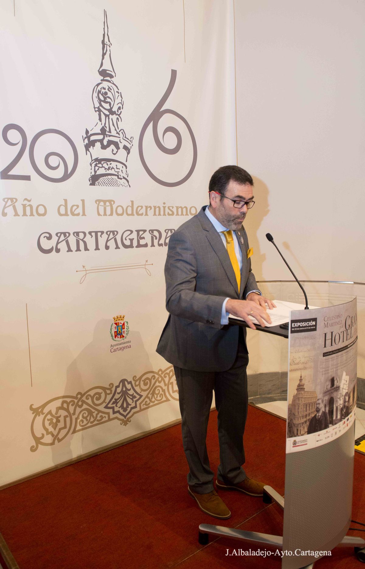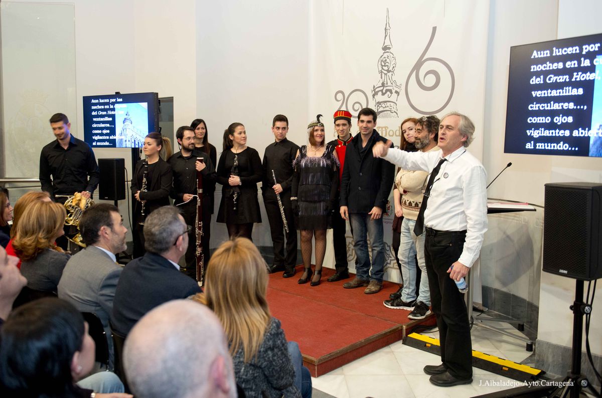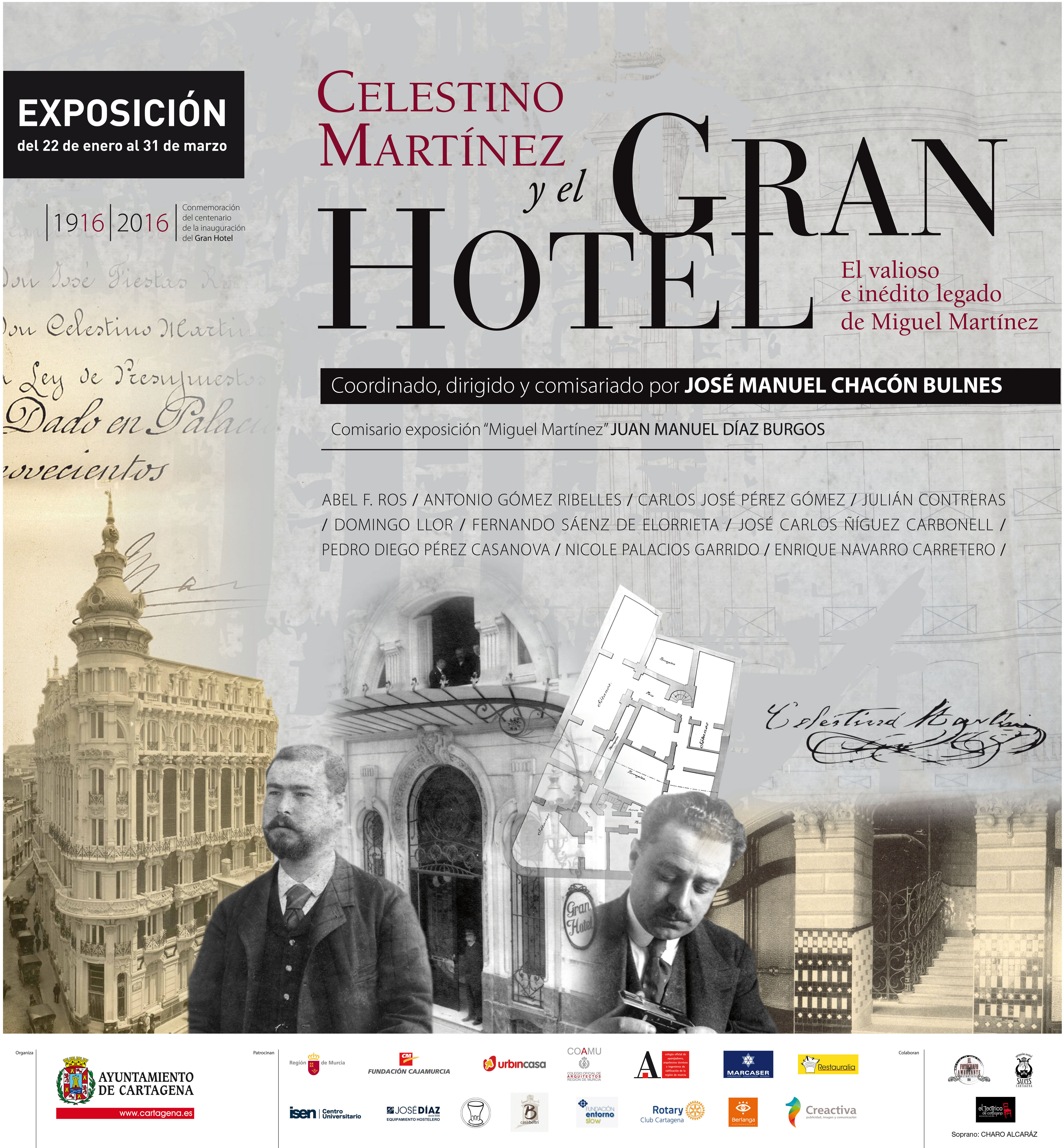 Celestino Martínez y el Gran Hotel es el título de la exposición y el libro que se presentó el viernes 22 de enero en el Palacio Consistorial. La muestra, organizada por el Ayuntamiento de Cartagena y patrocinada por diferentes entidades, entre ellas la Comunidad Autónoma de la Región de Murcia, permanecerá abierta hasta el 31 de marzo y se enmarca dentro de los actos conmemorativos del 2016, Año del Modernismo en Cartagena, coicidiendo con el centenario de la inauguración del Gran Hotel.