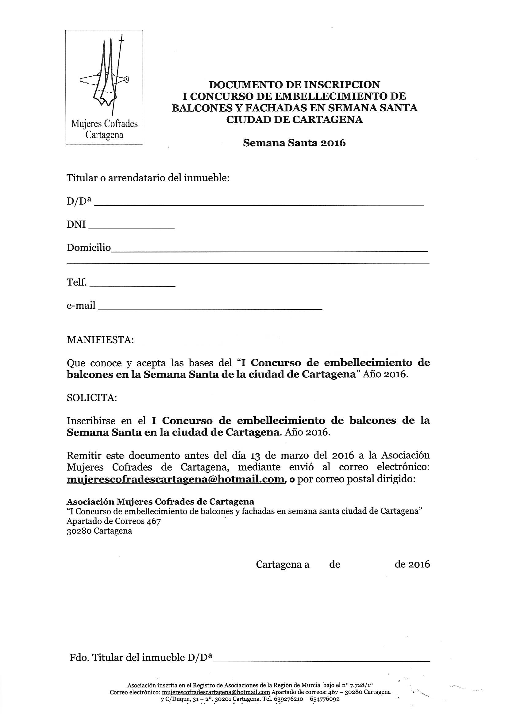 I Concurso de embellecimiento de balcones y fachadas en semana santa ciudad de Cartagena. Apartado de Correos 467 CP. 30280 Cartagena