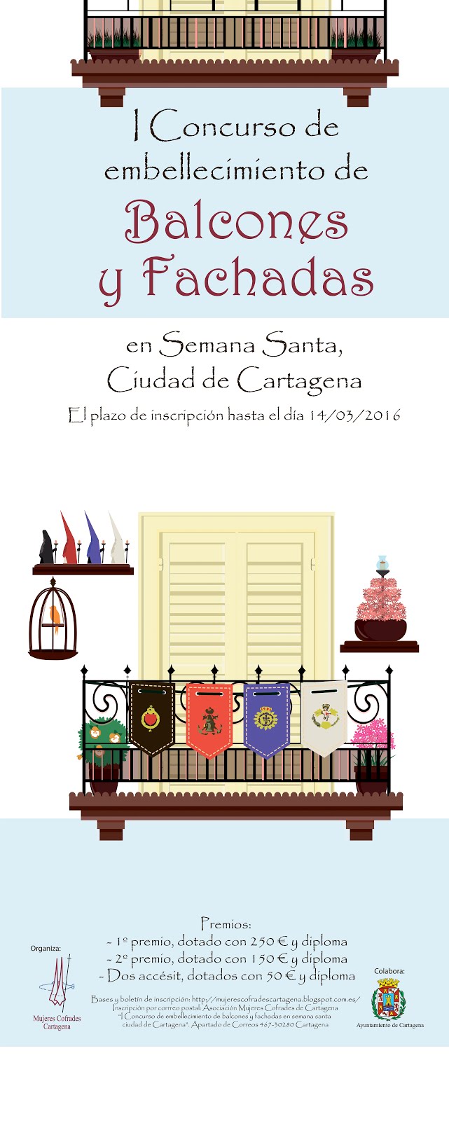 Cartagena se prepara para recibir la Semana Santa y este año lo hace por primera vez animando a los cartageneros a que adornen sus balcones. La asociación Mujeres Cofrades ha organizado este certamen para motivar a la gente a que se involucre en la Semana Santa de Cartagena y al mismo tiempo que la ciudad luzca radiante en esta festividad. El concurso pretende que los ciudadanos adornen sus balcones de manera original y que para ello usen banderas, flores, velas u otro ornamento que se les ocurra y que guarde relación con la Semana Santa.