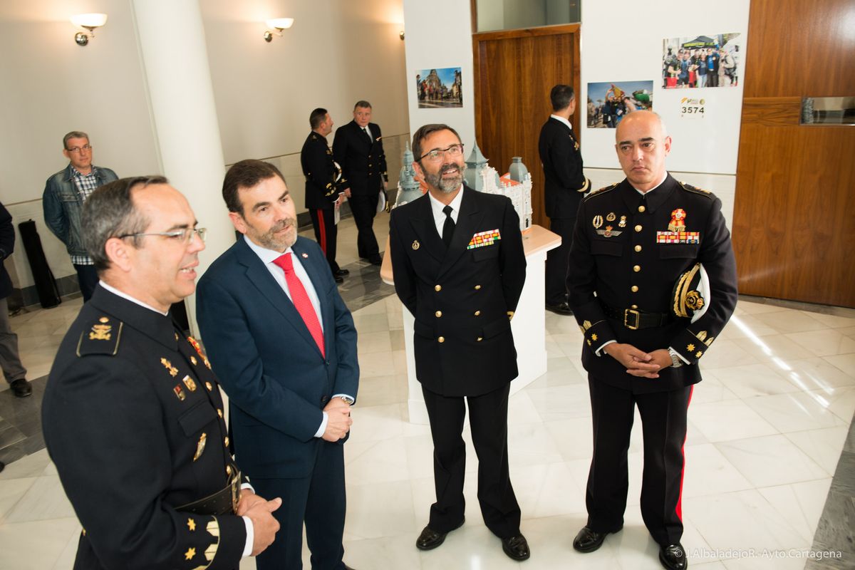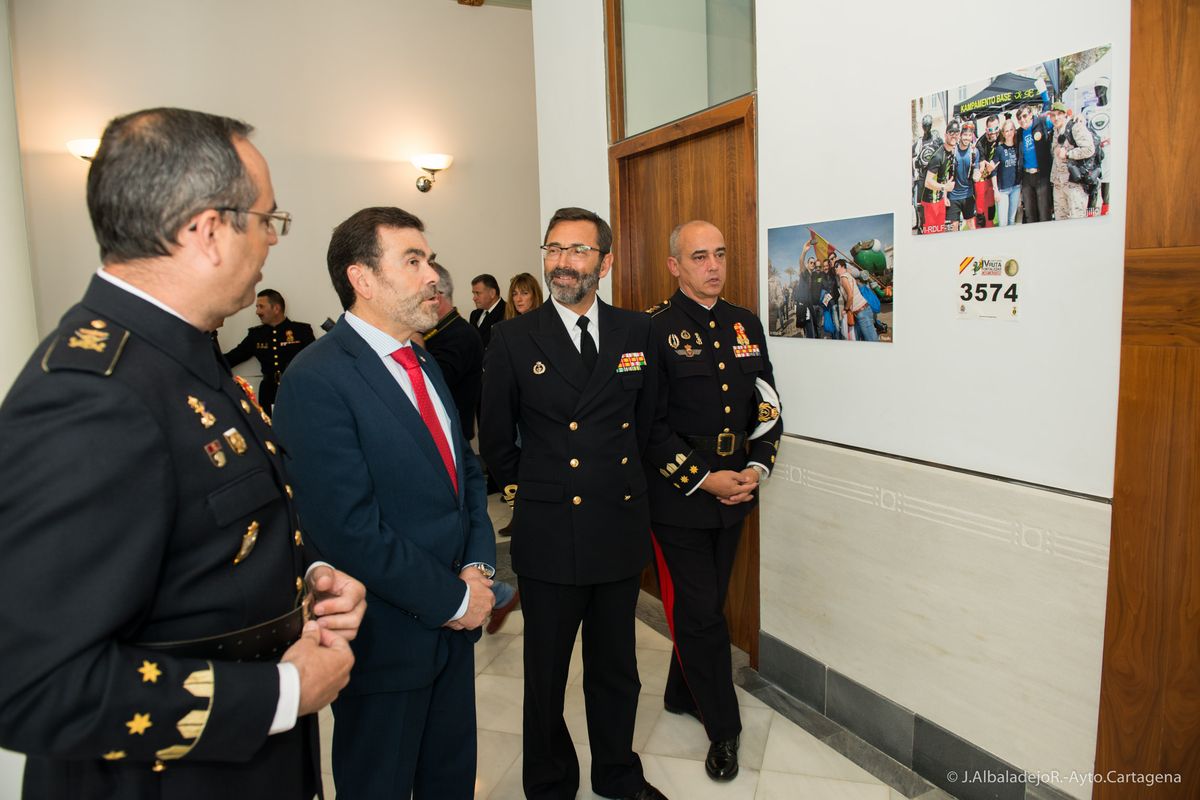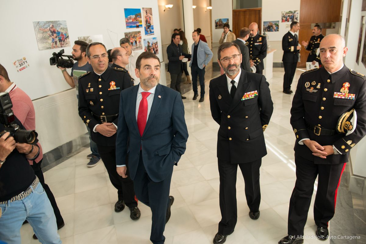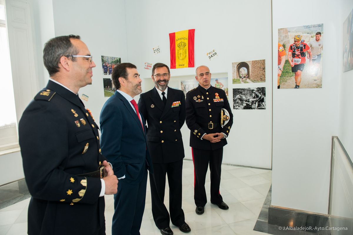 Tras el contacto con los medios, tanto los representantes de la Armada con el primer edil y el concejal de Deportes, Ricardo Segado, han recorrido las dependencias de la planta de abajo del Palacio Consistorial para contemplar una exposición de fotografías que engloba imágenes de las pasadas ediciones de la Ruta de las Fortalezas y a la que pueden acercarse todos los interesados en visitarla.