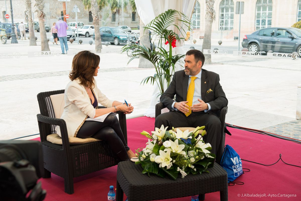 El alcalde y la vicealcaldesa han estado esta mañana en una entrevista en directo de GTM Televisión en la explanada del puerto como parte de un magazine especial con motivo de la Ruta de las Fortalezas. Durante el programa también han contado con intervenciones de otros cargos relacionados con la organización del evento, como el comandante director de la Escuela de Infantería de Marina, Rafael Roldán. El alcalde ha aprovechado para destacar Cartagena como destino turístico por excelencia de la Región.
