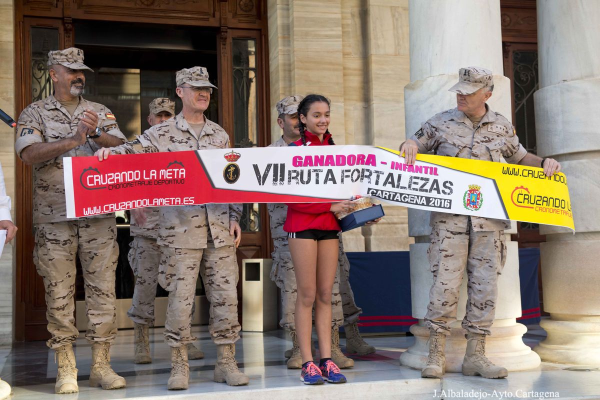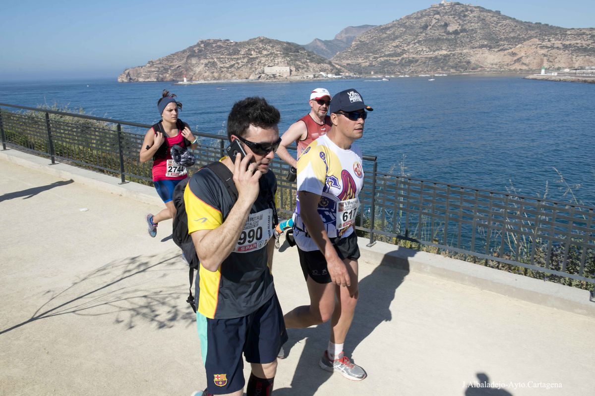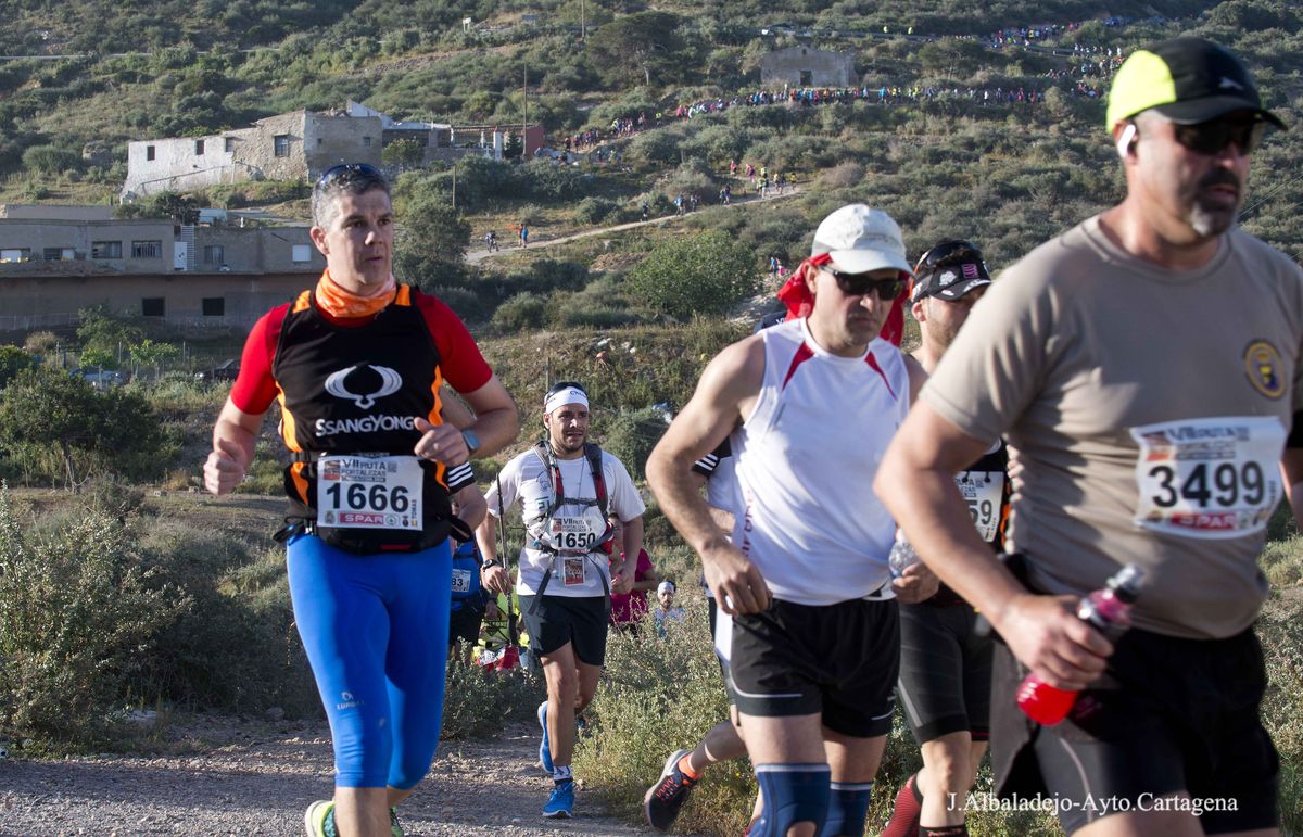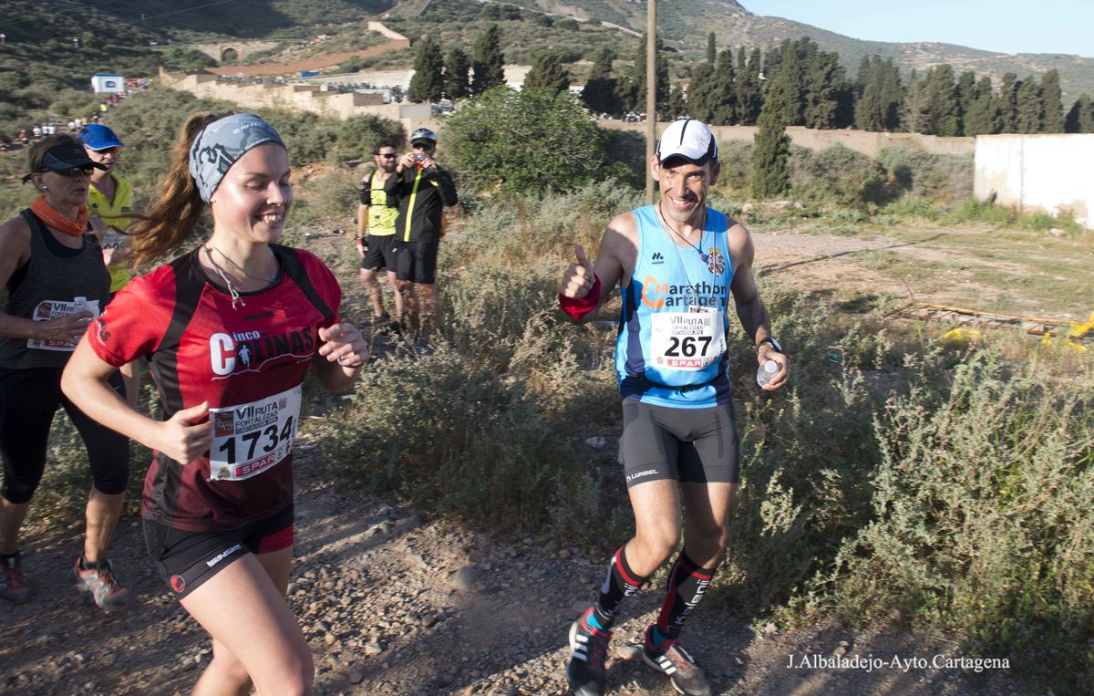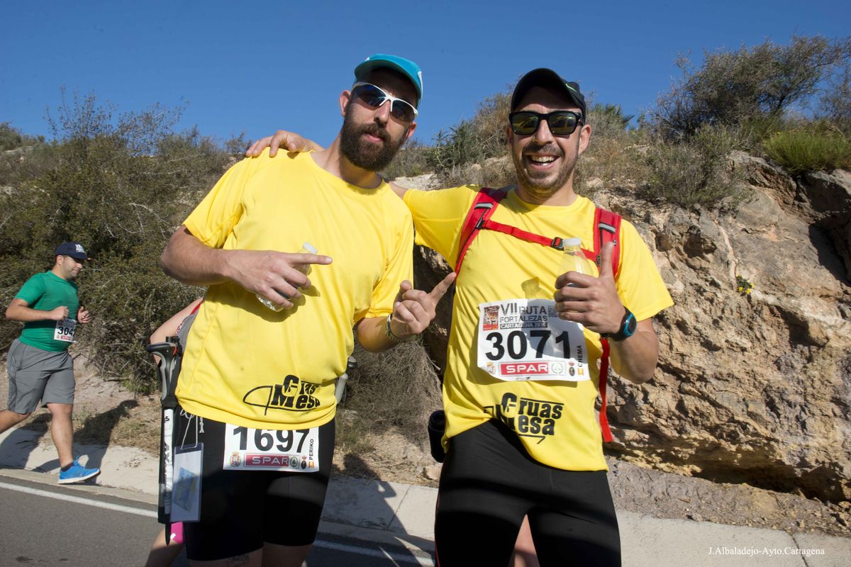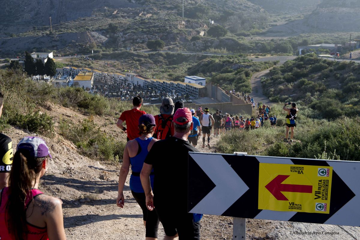 El calor, con temperaturas que rondaron los 30 grados, fue el protagonista de la VII Ruta de las Fortalezas que organizó el Ayuntamiento de Cartagena y la Armada Española, a través de la Escuela de Infantería de Marina General Albacete y Fuster. La dureza de esta prueba de 51 kilómetros por antiguas fortificaciones y baterías de costa de los montes que circundan la ciudad se vio incrementada por un sol radiante, pero no fue óbice para que los primeros corredores hicieran su aparición antes de las doce del mediodía, completando el recorrido en menos de cuatro horas y batiendo una nueva marca para esta prueba que año tras año se consolida a nivel nacional.