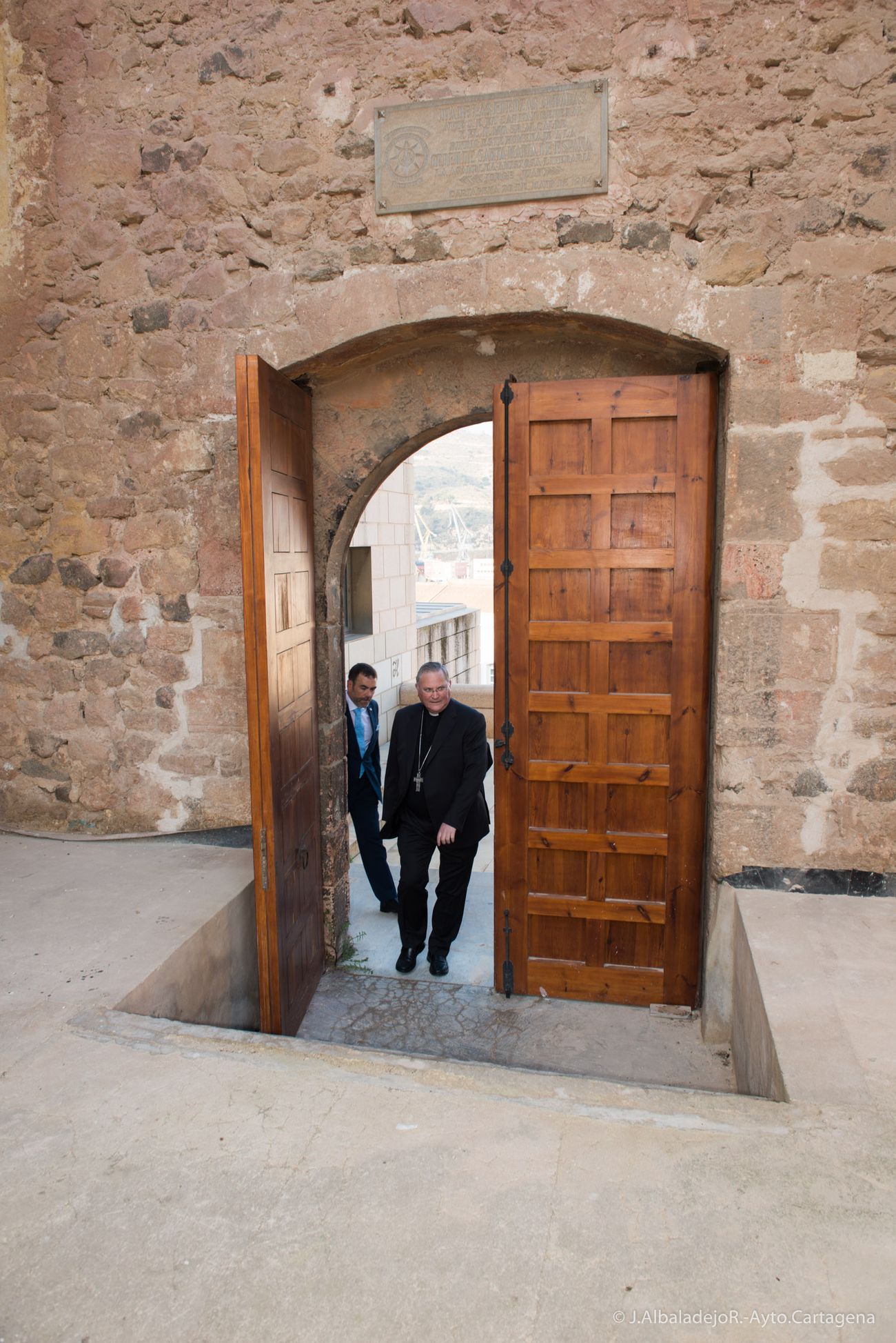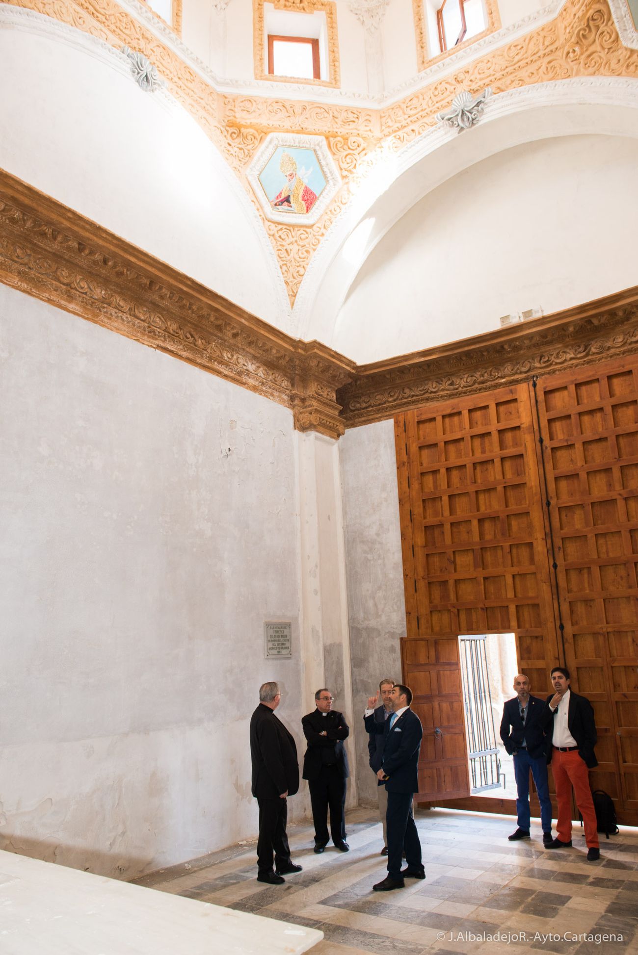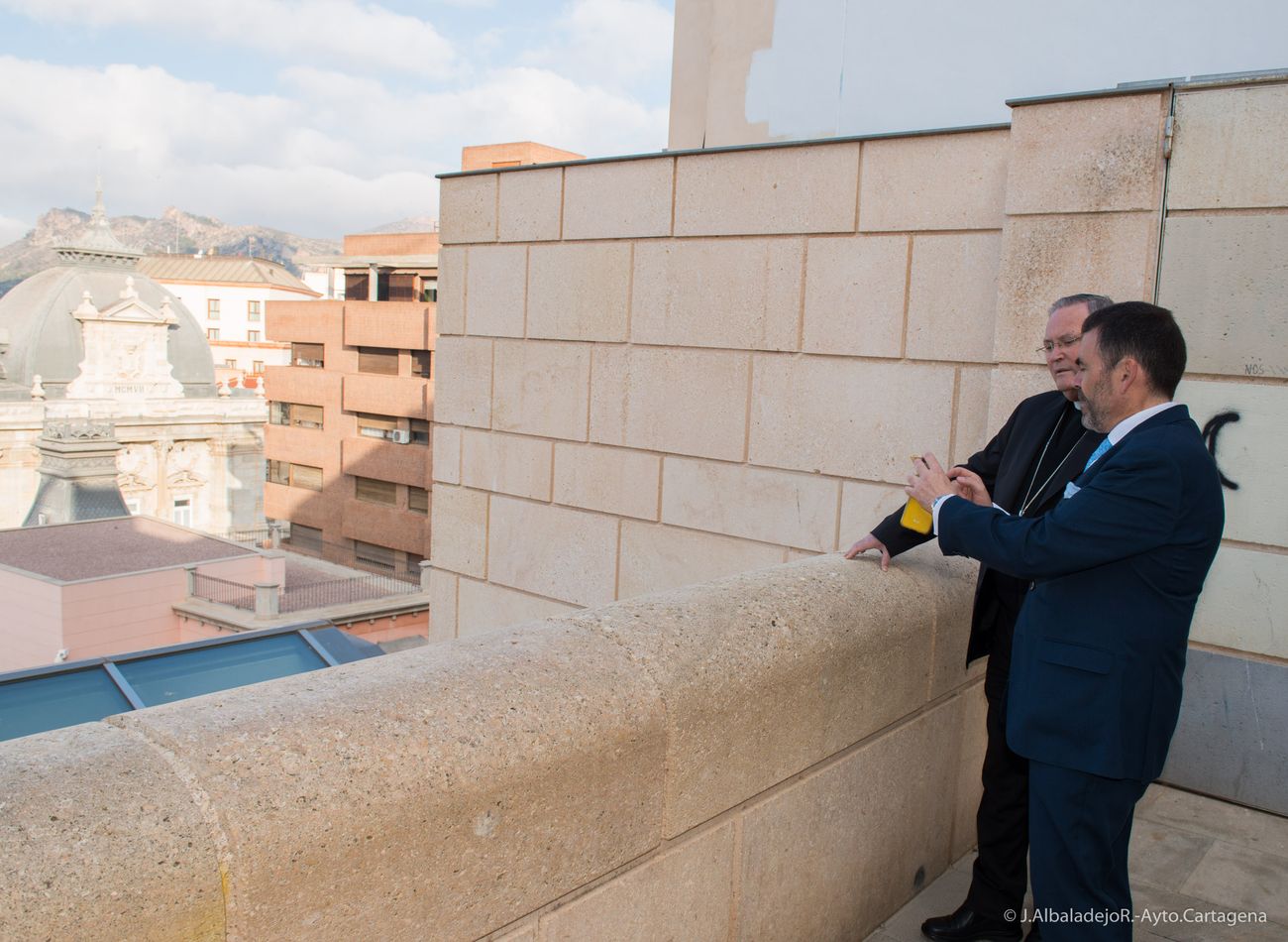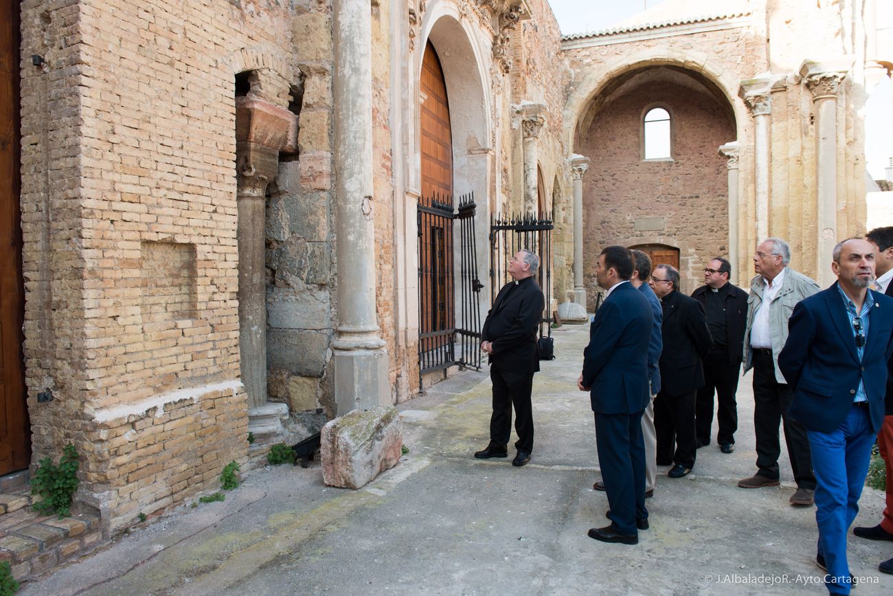 Durante la visita, el arquitecto de la Díocesis, Juan de Dios De la Hoz, le ha explicado al obispo las últimas reformas que se han llevado a cabo y la normativa en reconstrucción de este tipo de edificios, acompañado también del vicario de Cartagena, José Abellán.