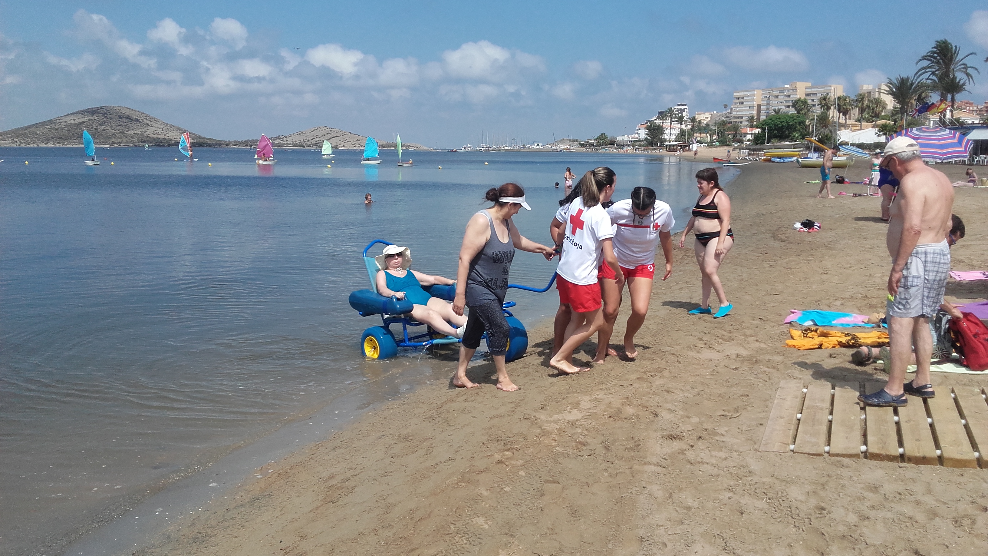 Durante estos días, turistas de toda España disfrutan de las playas cartageneras gracias a las medidas que se han adoptado para mejorar su accesibilidad. En la mañana de hoy, 13 de julio, decenas de turistas de Cataluña con movilidad reducida se han acercado hasta el litoral del Cavanna, donde seis voluntarios de Cruz Roja y dos sillas anfibias han facilitado que pudieran disfrutar de un refrescante baño.