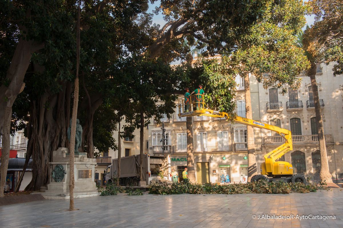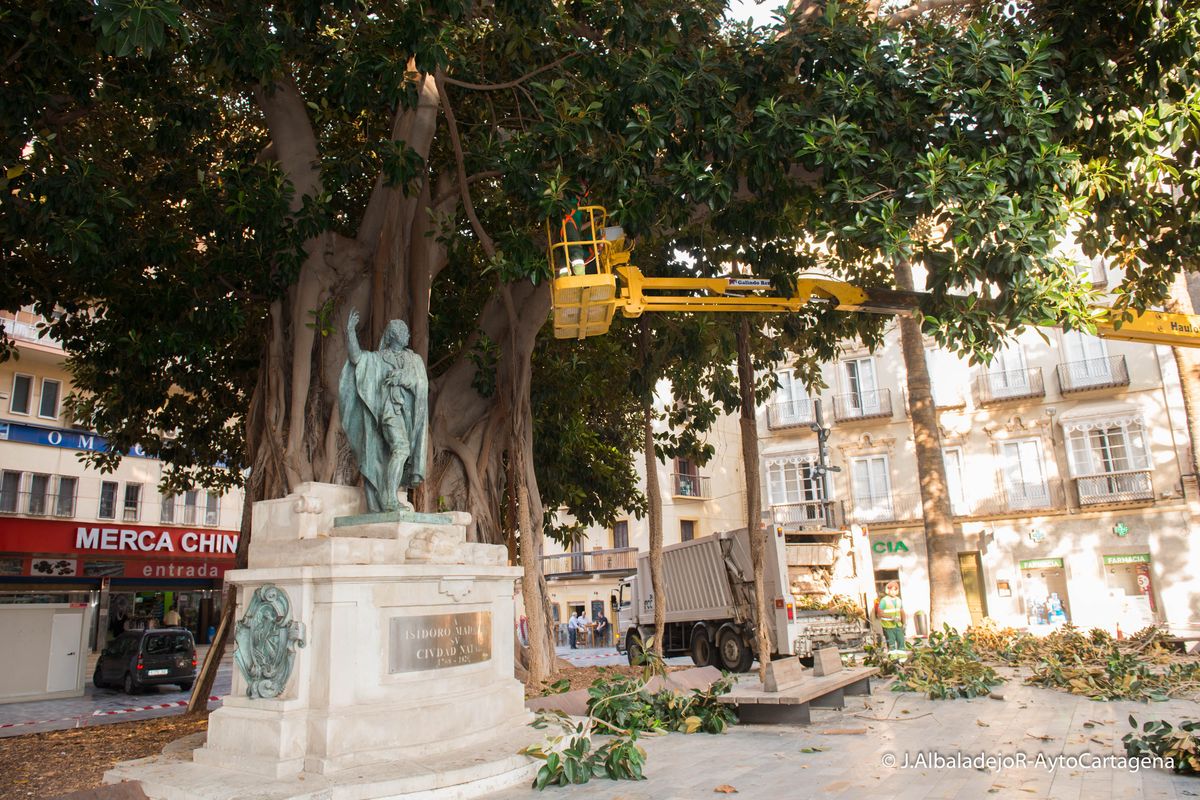 Se trata de una poda de clareo y consolidación de ramas, para evitar la su caída a la vía ública. En concreto se va a actuar sobre los ejemplares existentes en la glorieta de San Francisco; Plaza de España; Muralla del Mar; UPCT (campus de la Muralla) y Gobierno Militar.