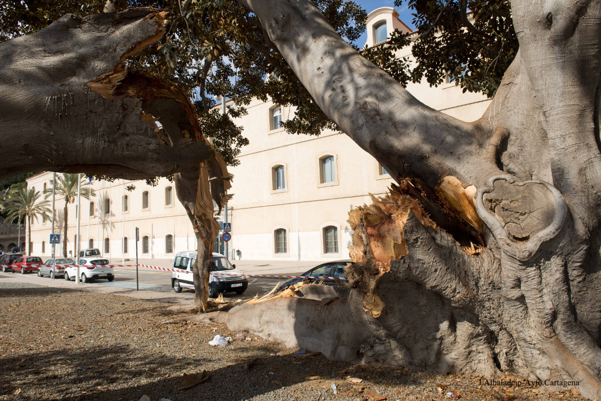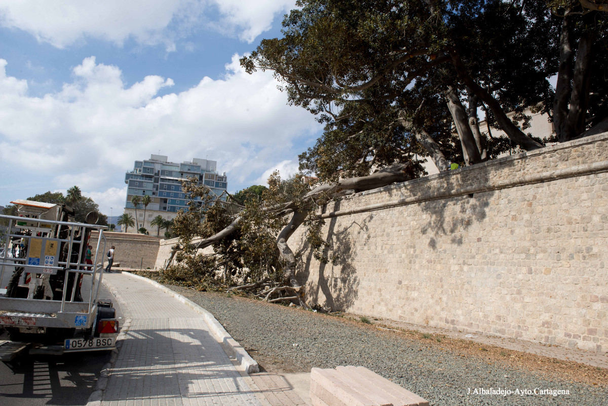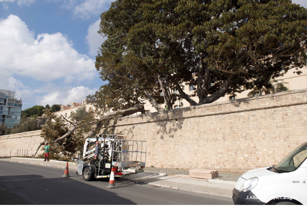 Operarios de Parques y Jardines han trabajado en las tareas de retirada de la rama que se desprendió ayer martes por deshidratación sin causar daños personales, aunque afectó a un pretil de la Muralla, lo cual será valorado por la Concejalía de Patrimonio Arqueológico