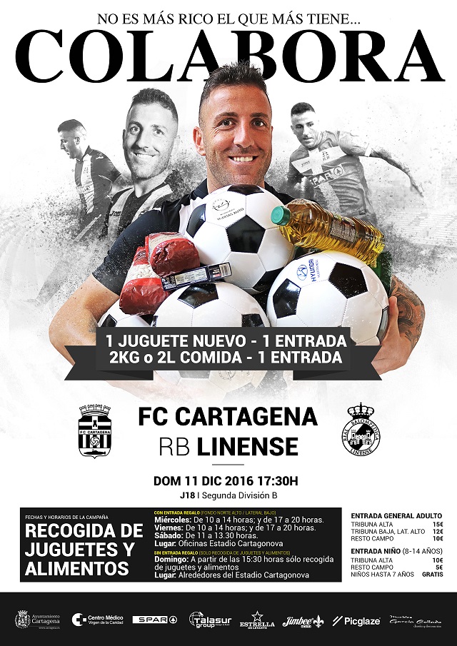 El conjunto albinegro regalará una entrada en Fondo Norte Alto o Lateral Bajo a toda persona que entregue a lo largo de la semana un juguete nuevo o dos kilos de alimento, colaborando así con la Campaña de Recogida de Juguetes del Ayuntamiento de Cartagena