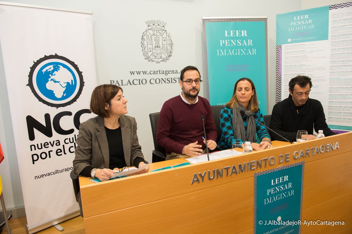 Durante la presentación, el concejal ha estado acompañado por la escritora Pilar Fernández; la directora del Festival Internacional de Cine de Cartagena (FICC), Esther Baeza; y el presidente de la asociación 'Nueva Cultura por el Clima', Antonio Soler.