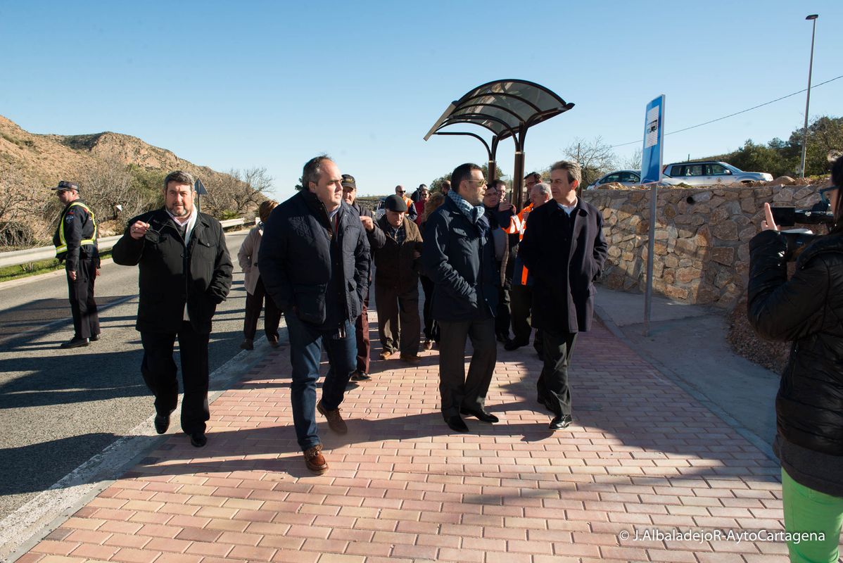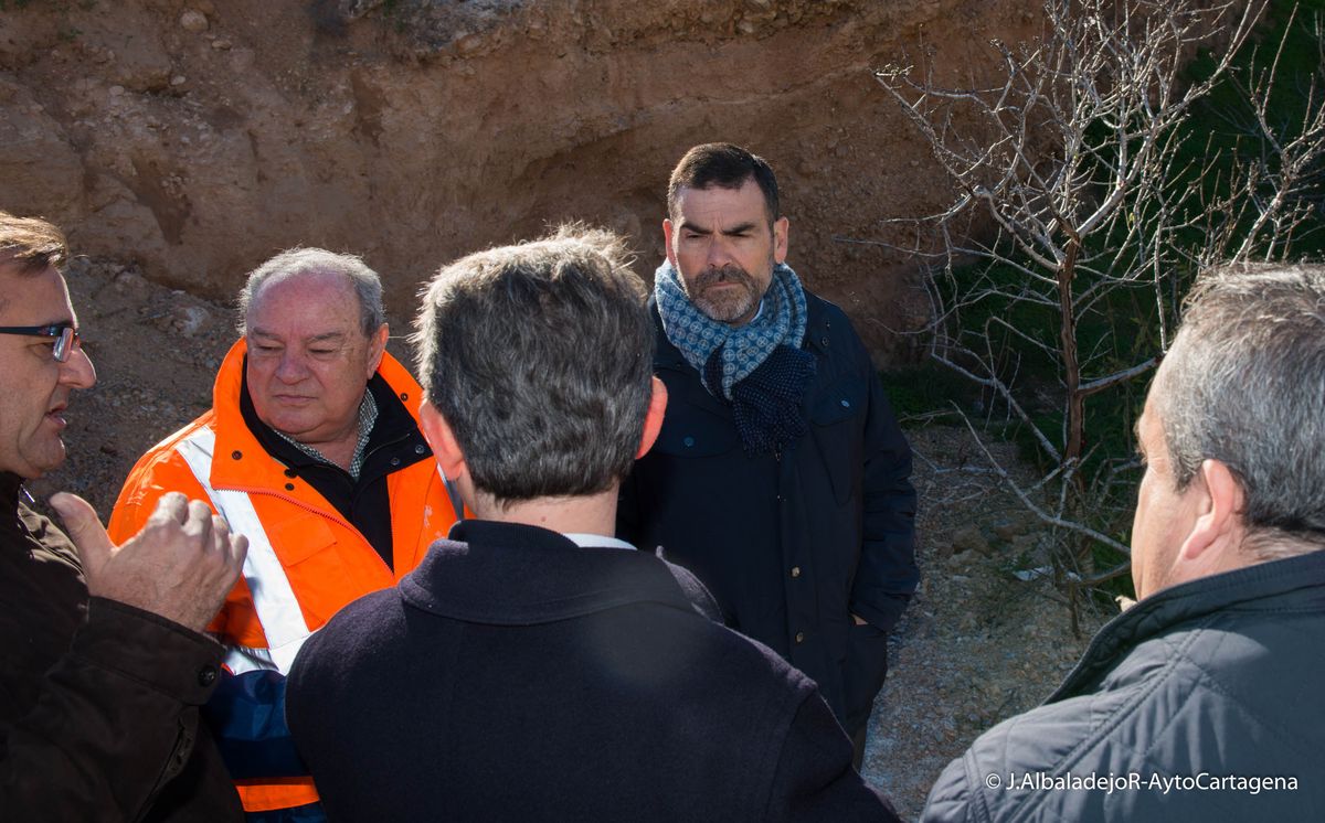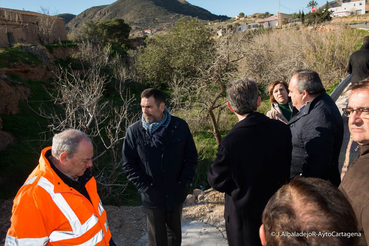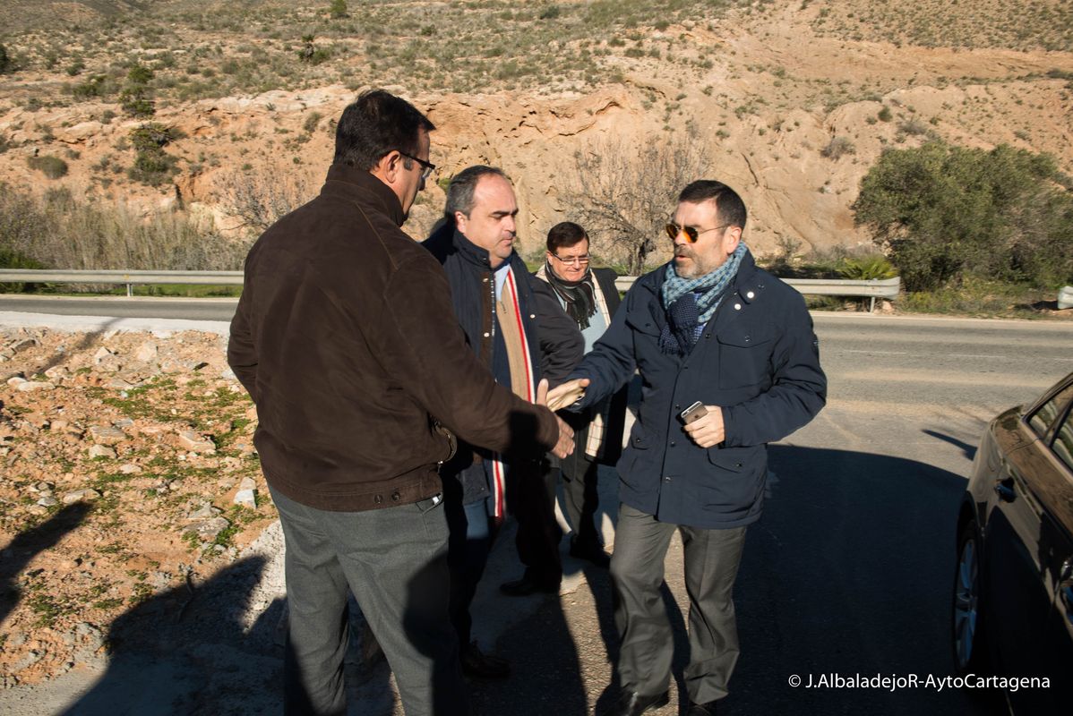 El alcalde de Cartagena, José López, ha visitado hoy lunes, acompañado por el Director General de Carreteras de la Comunidad Autónoma de la Región de Murcia, José Antonio Fernández, el concejal del Área de Descentralización, Juan Pedro Torralba, y el presidente de la Junta Vecinal de Perín, Juan Agüera, las obras de construcción de muros en la carretera RM E-22, que va de Canteras a Isla Plana y La Azohía, en el entorno de la Torre de Nicolás Pérez.