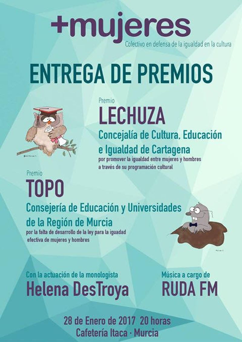 'Premio Lechuza' 2017 a la Concejalía de Cultura, Educación e Igualdad del Ayuntamiento de Cartagena, dado que según las bases de este galardón se concede el mismo a "instituciones, organismos y/o personas que, en el desempeño de su labor social y a través de las acciones que realizan,