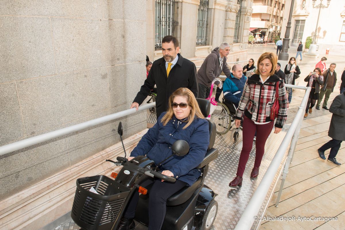 Este martes, 31 de enero, se ha puesto en funcionamiento la plataforma desmontable que se ha instalado en el Palacio Consistorial para facilitar el acceso de personas con discapacidad a su interior, en un acto en el que el alcalde, José López, ha estado acompañado por los concejales de Servicios Sociales y de Calidad de Vida, Carmen Martín y Francisco Calderón, respectivamente.