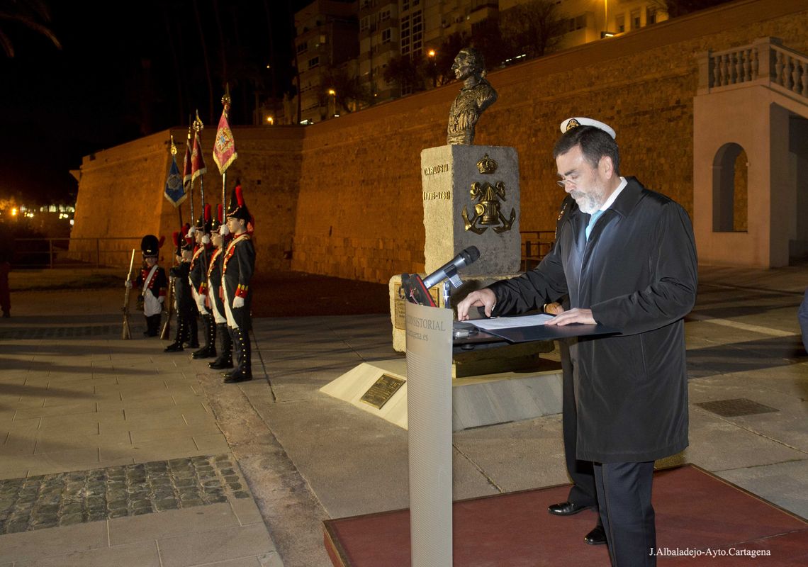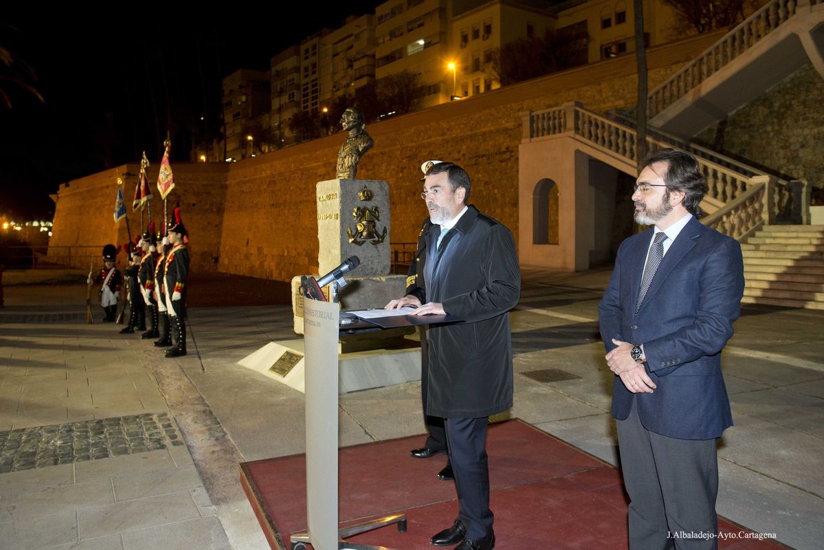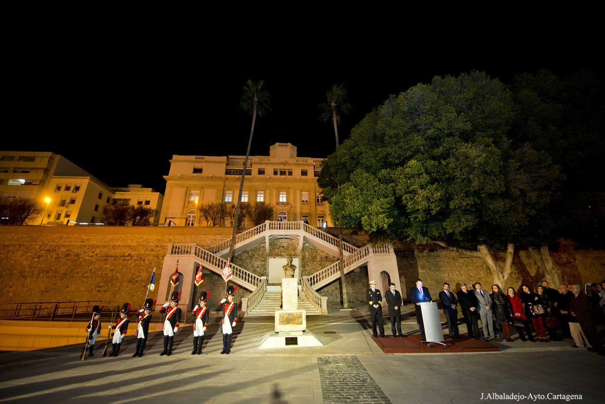 La nueva ubicación del busto del Rey Ilustrado a los pies de la escalinata de Servicios Generales se presentó en un acto presidido por el alcalde, José López, al que asistieron numerosos representantes de la sociedad civil y militar cartagenera, y en el que se repasó la extensa obra del monarca en la ciudad portuaria
