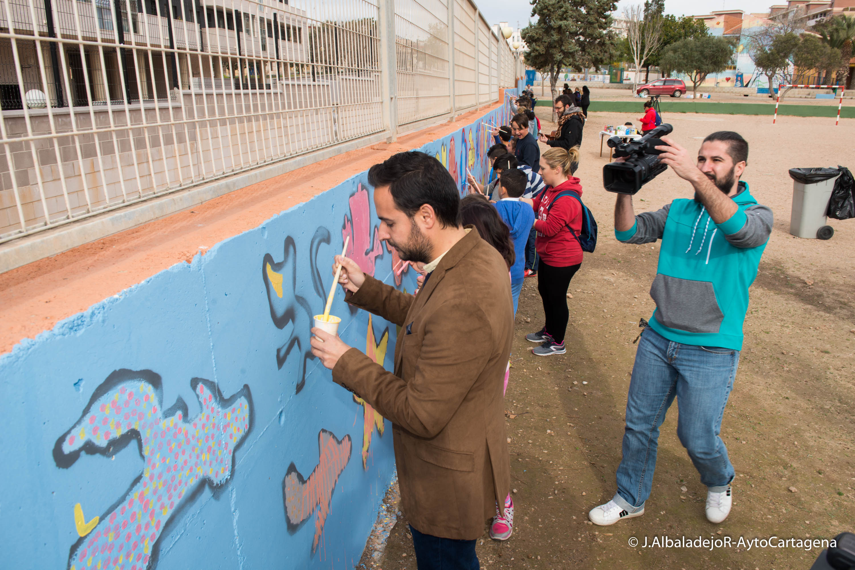 del centro educativo. Armados con pinceles y botes de pintura niños y adultos daban color y personalidad a las siluetas de flores, monos, perros, aviones o estrellas. Una tarea en la que ha colaborado el concejal que ha charlado también con los alumnos para conocer su opinión de este proyecto. "Desde el fin de semana, en el que empezaron los murales 'La Compañía de Mario', y hoy con el alumnado del centro, estamos llevando a cabo esta iniciativa que busca dar más alegría a los colegios, decorarlos, y sobre todo que los alumnos se sientan partícipes de esta actividad y parte activa del centro", ha explicado el concejal, que ha agradecido sobre todo la implicación del AMPA y el profesorado en esta iniciativa.