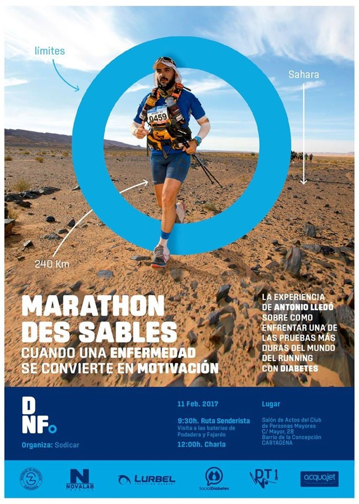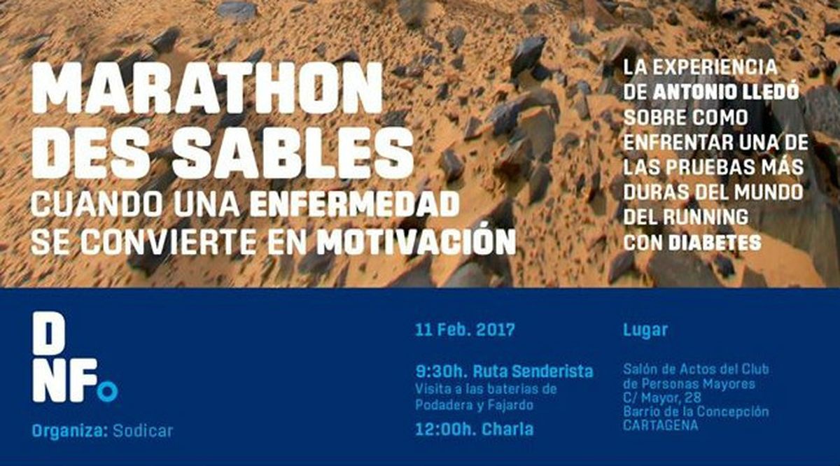 La Sociedad de Personas con Diabetes de Cartagena y Comarca (SODICAR) ha organizado el evento 'Marathon des Sables. Cuando una enfermedad se convierte en motivación', que tendrá lugar este sábado, 11 de febrero, en el salón de actos del Local Multiusos de la Federación de Asociaciones de Mayores, y en el que participará el deportista con DM1, Antonio Lledó.
