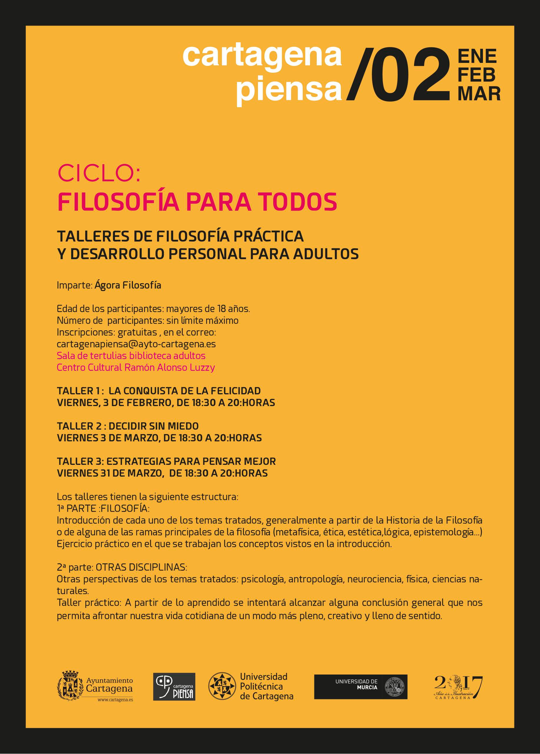 El ciclo de filosofía para adultos, compuesto por tres talleres, finaliza el viernes 31 de marzo con su tercer y último taller del programa trimestral de Cartagena Piensa.