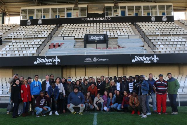 70 inmigrantes, transeúntes y personas en riesgo de exclusión social visitaron el estadio municipal en una actividad organizada por la Fundación Cartagena F.C. y la Concejalia de Servicios Sociales y Mediación Social del Ayuntamiento de Cartagena