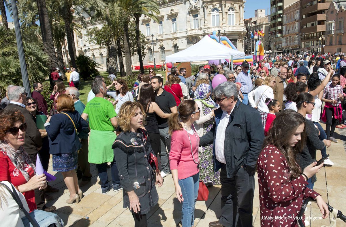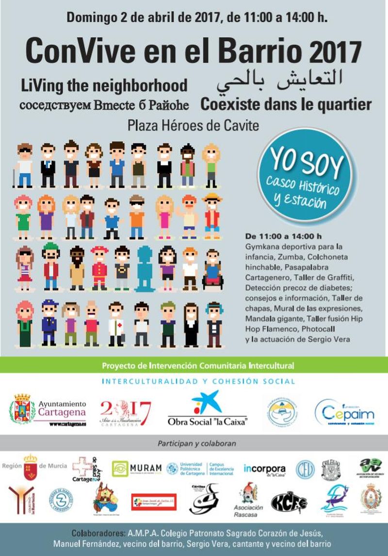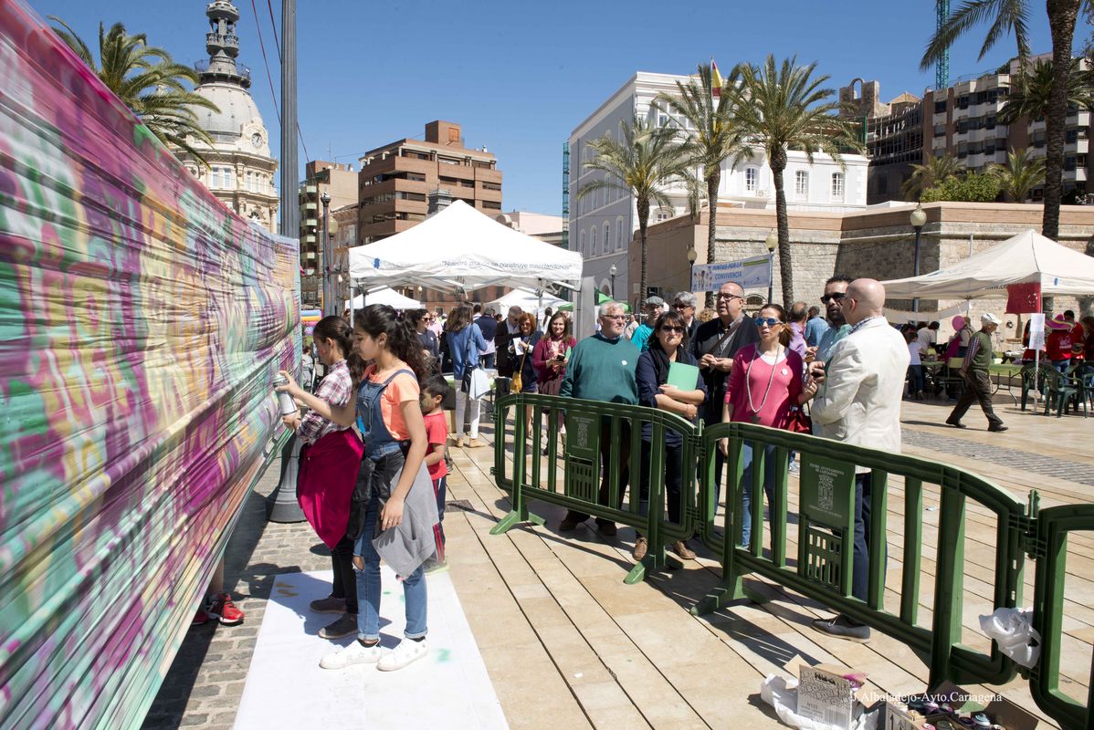 III edición de 'ConVive en el Barrio', una iniciativa que cuenta cada año con una mayor implicación en la elaboración y planificación de las actividades por parte de los propios vecinos de estos barrios. Los asistentes pudieron participar en un taller de grafiti, clases de zumba, diversos juegos infantiles, taller floral, el gran mural de las expresiones, taller de fusión de Hip-hop Flamenco o el Pasapalabra Cartagenero.