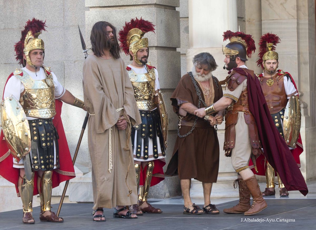 La escenificación del drama del pretorio congregó a centenares de personas en la plaza del Ayuntamiento, como preludio de la procesión california del Miércoles Santo