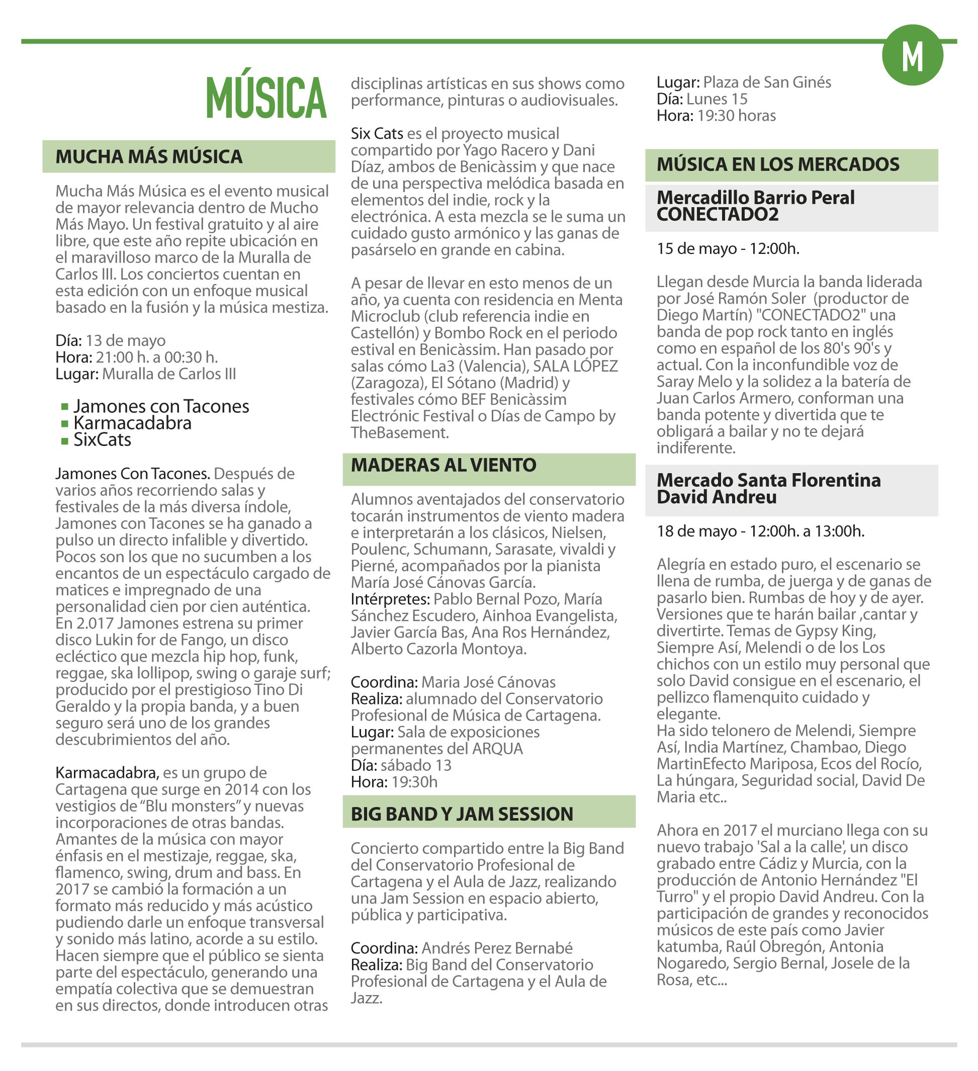 Festival de Arte Emergente Mucho Más Mayo, que se celebra en la ciudad de Cartagena. Los conciertos cuentan en esta edición con un enfoque musical basado en la