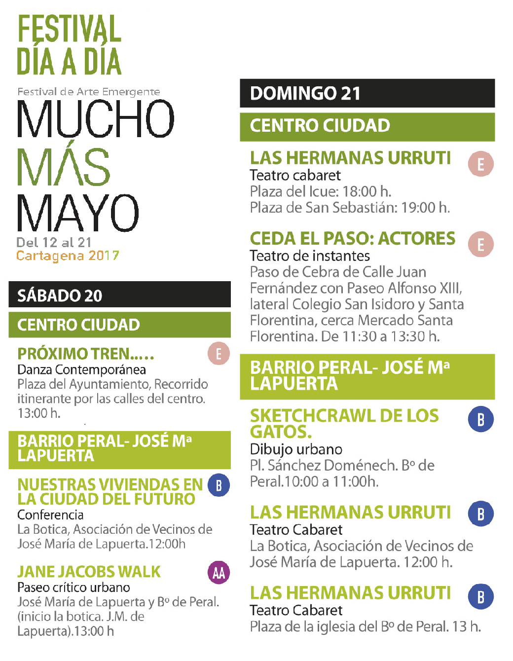 segundo ‘Paseo Jane Jacobs walk’ del Festival Mucho Más Mayo 2017, esta vez en los barrios. Será un recorrido urbano que permitirá establecer entre las personas participantes un contacto con el entorno y con otras personas, generando complicidades y creando un espacio para que el barrio se descubra a sí mismo. Esta propuesta inspirada en la visión de la activista Jane Jacobs, defensora de un urbanismo mas humanizado, tendrá a partir de las