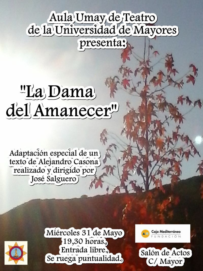 'La Dama del Amanecer', que así se titula la obra, se representará el próximo miércoles 31 de mayo a las 19:30 horas en el Salón de Actos de la Fundación Caja Mediterráneo. La entrada es gratuita y se ruega puntualidad
